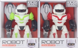 Plastrobot på batterier med skjold og pistol. Roboten går, drejer, laver lyde og lyser. Drives af 3 AA-batterier (medfølger ikke). Robotens mål ca. 16 x 21 cm. Emballagens mål ca. 19,5 x 24 x 9,5 cm. Alder 3+