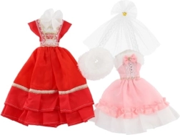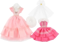 To forskellige sæt kjoler, hver med sine egne detaljer, der giver hver dukke et unikt look.