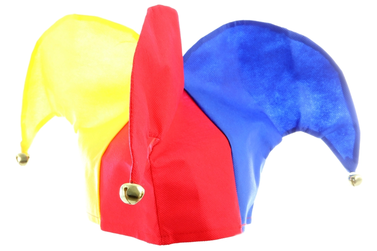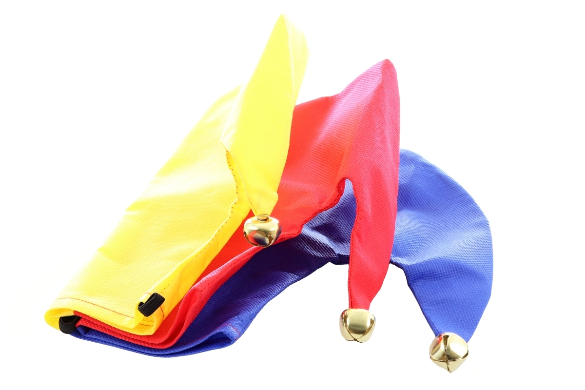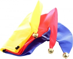 Farverig klovnehue i gul, rød og blå med metalbjælder for en legende effekt ved hver bevægelse.