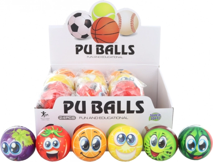 En sød og sikker bold med frugtmotiv, der glæder børn fra 3 år. Med en diameter på ca. 7 cm ligger den godt i hånden, er blød, let og egnet til leg både inde og ude.