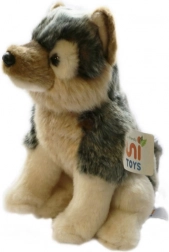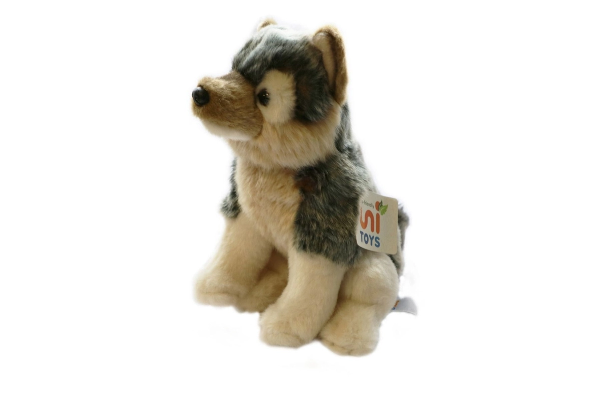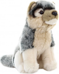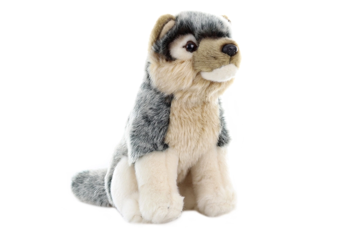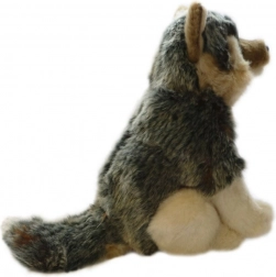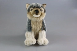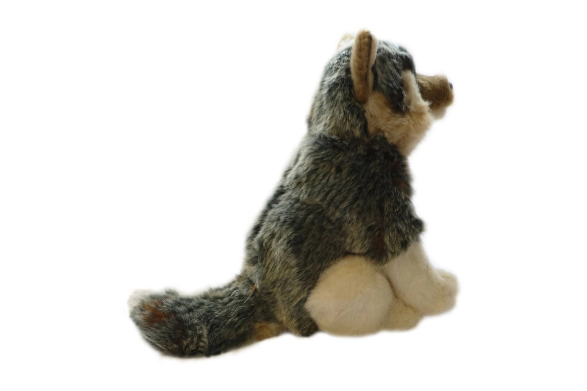 Plys-varg siddende med en størrelse på ca. 20 x 24 x 11 cm (uden hale). Halen er ca. 9 cm lang. Alder 0+