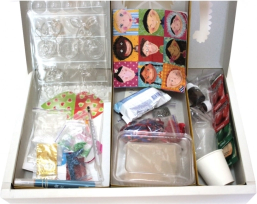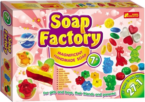Det store sæt til sæbefremstilling er en smuk gave til alle kreative børn. Sættet indeholder alt, hvad der er nødvendigt for at lave op til 27 sæber (mønter, hjerter, knapper, dyr, blomster, kage, slik og andre former). Sættet indeholder f.eks. sæbebase, fødevarefarve, farvet serviet, duftolier, bægre, pipette, glimmer, skabeloner, perler, bånd og meget mere. Pakningsstørrelse ca. 44 x 30 cm. Alder 7+. FREMSTILLET I EUROPA