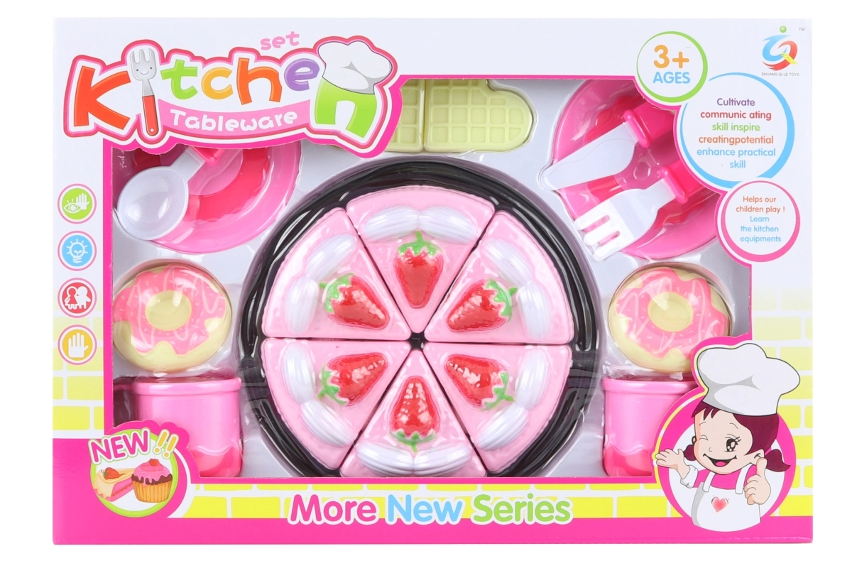Sjovt plastiksæt til små kokke, som indeholder alt, hvad der skal til for servering og skæring af kage. Sættet indeholder en kage med en diameter på ca. 15 cm, 2 krus, 2 tallerkener, små kager og bestik. Ideelt til rolleleg i køkkenet og udvikling af finmotorik. Velegnet til børn fra 3 år.