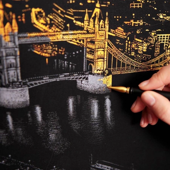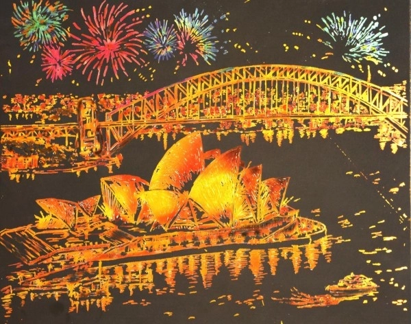 Oplev magien ved skrabeteknikken: Under det sorte lag gemmer der sig en gylden baggrund, som giver hvert skrabet strøg en kontrastfuld, elegant effekt. Motivet af det ikoniske Operahuset i Sydney i natteudgave glæder både begyndere og øvede, og det færdige billede bliver en original dekoration.