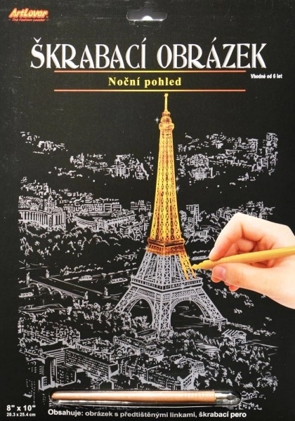 Sættet er klar til brug med det samme – det indeholder et billede i størrelsen 20 × 25 cm og en skrabepen i plast på 14 cm. For mindre børn anbefales opsyn af en voksen på grund af den skarpe spids.