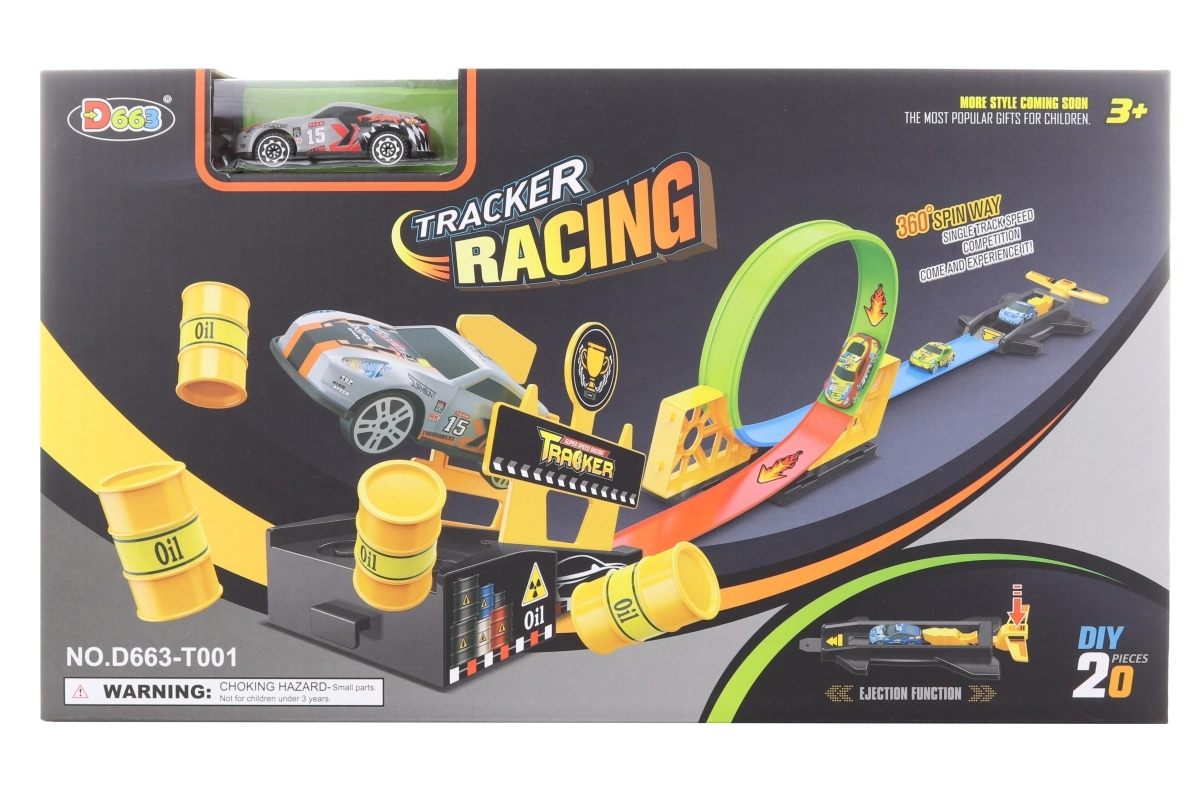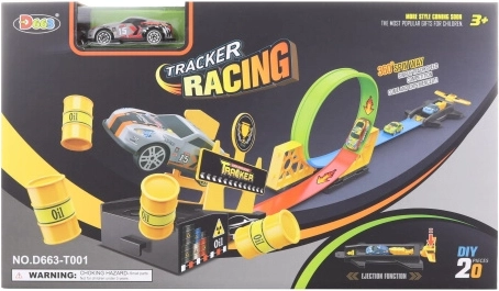 Affyringsbane med lille metalbil. Banens længde ca. 125 cm. Pakkens mål ca. 38 × 22 × 6 cm. Alder 3+