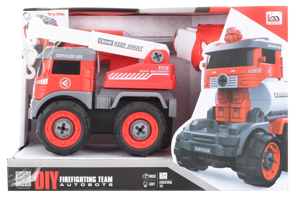 Sjov byggesæt og RC-legetøj i ét: en skruebar brandbil, som kan samles med det medfølgende værktøj, styres frem og tilbage og endda transformeres til en robot. Takket være den aftagelige motor fra boremaskinen, lyseffekter og lyde giver den børn fra 3 år timevis af kreativ leg. Skru og byg, fjernstyring, transformation til robot, lys og lyde samt praktisk strømforsyning gør den til en fremragende gave.