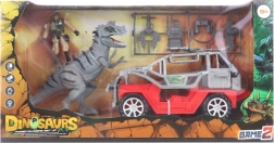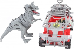 Dette sæt indeholder en grå dinosaur, et terrængående køretøj og en figur i militærdragt for den ultimative legeoplevelse.