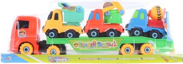 Sjovt sæt til små byggere: en plastskruelastbil med tre byggebiler støtter finmotorik, logisk tænkning og kreativ leg. Ideel gave til børn fra 3 år.