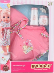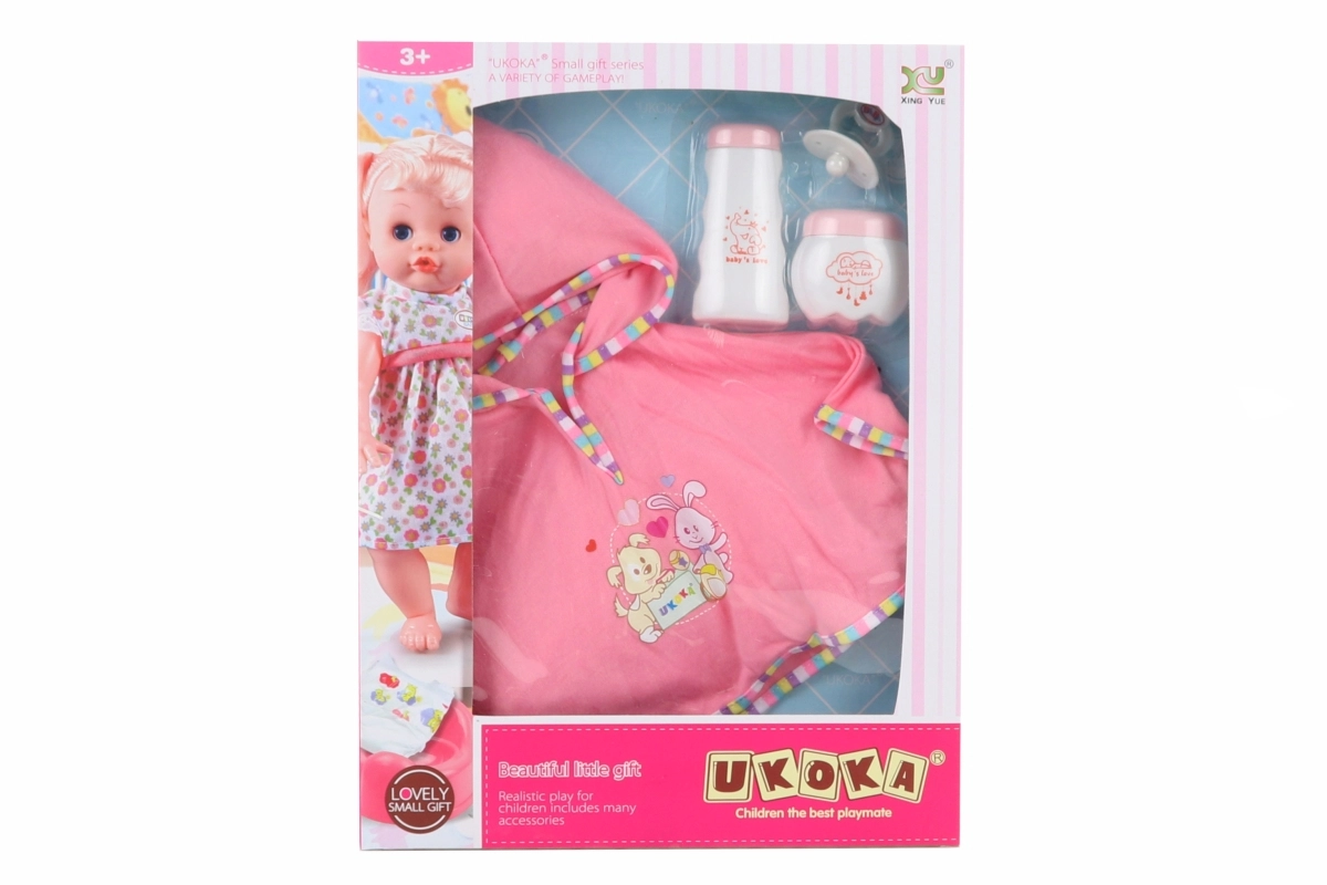 Dette alsidige tilbehørssæt til en 45 cm dukke er et fantastisk supplement til enhver børnesamling. Med poncho, sut og flasker kan børn lege, at de passer en baby og udvikle deres forestillingsevne.