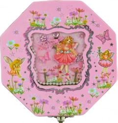 Denne yndefulde musik-smykkeskrin i rosa med eventyrlige motiver er det perfekte sted at opbevare ringe, øreringe og andre småting. Når nøglen drejes, snurrer ballerinaen elegant foran spejlet, mens skrinet spiller en blid melodi.
