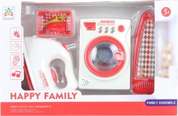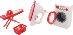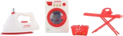 Dette attraktive sæt til børneværelset lader små husmødre og husherrer efterligne almindelige huslige aktiviteter. Børn træner finmotorik, koncentration og ansvar, mens de nyder sikker og kreativ leg. Modellerne af apparaterne er farvekoordinerede i rød-hvid og efterligner overbevisende de rigtige maskiner.