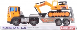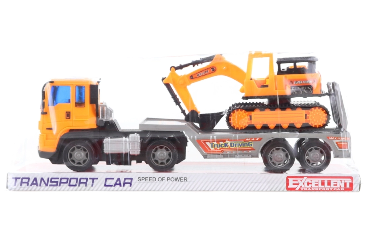 Plastlastbil med gravemaskine, ca. 28 x 10,5 x 8 cm. Emballagens størrelse ca. 32 x 13 x 9 cm. Alder 3+