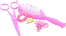 Pakken indeholder et rigt sæt tilbehør: kam, elastikker, spiraler og hårklemmer, som gør legen sjov og sikker. Produktet er designet til små hænder og støtter udviklingen af fantasi og fingerfærdighed.