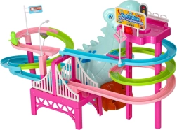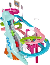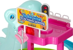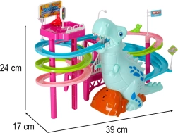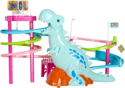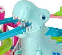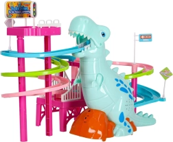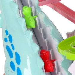 Denne farverige racerbane med dinosaur-tema begejstrer både mindre og større børn. Når bilerne formet som små dinosaurer suser afsted, udsender den store dinosaur realistiske brølende lyde, og banen oplyses af LED-lys. En enkelt kontakt styrer nemt både bevægelse og effekter, så børn kan fokusere fuldt ud på legen.