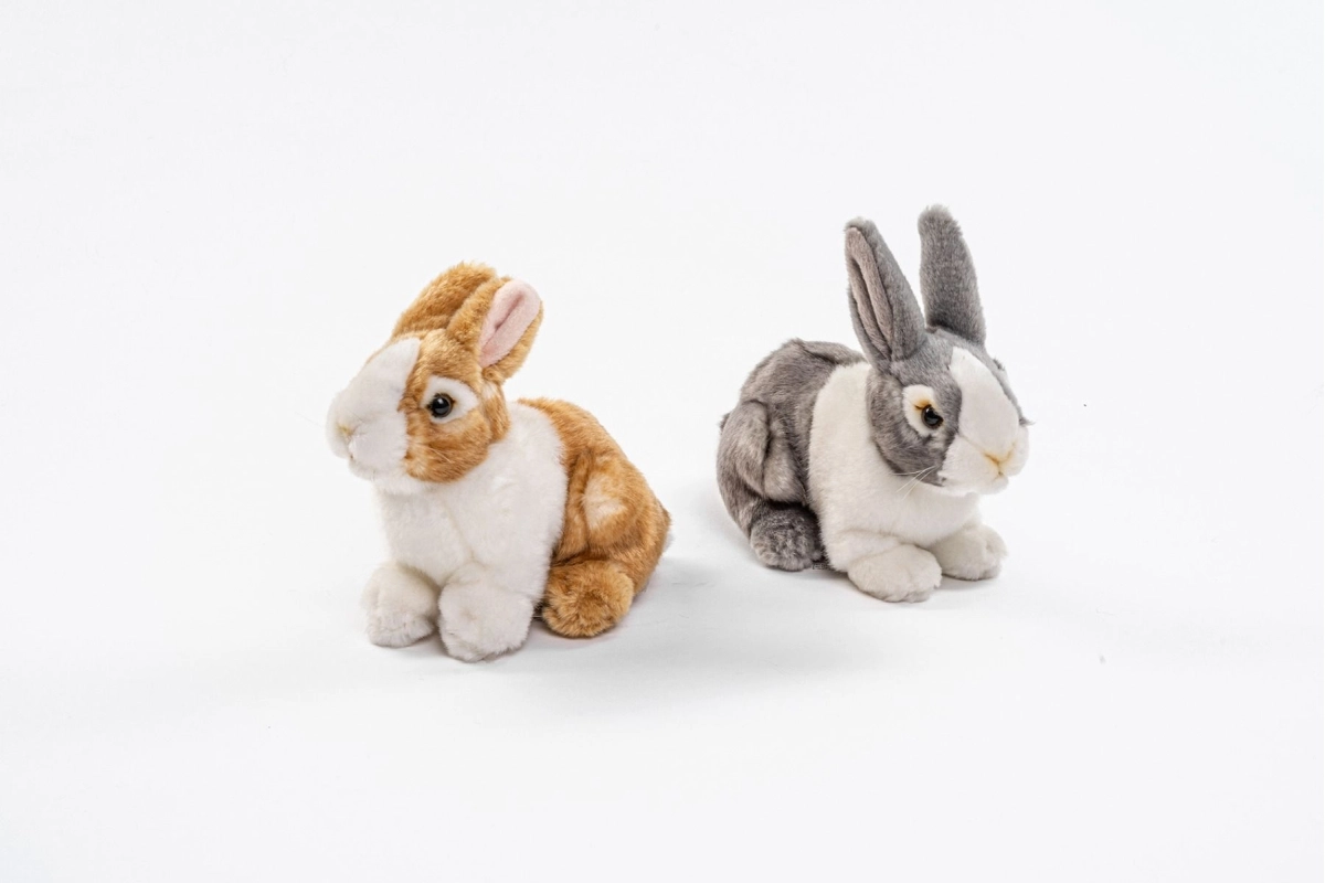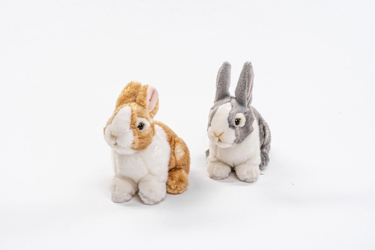 Realistiske detaljer som oprejste ører og afdæmpet farve giver kaninen charme, mens kvalitets-syninger og behageligt materiale sikrer sikker og komfortabel kramning for de mindste.