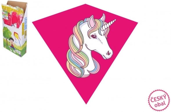 Lyserød flyvende drage med enhjørningemotiv fanger opmærksomheden på himlen ved enhver lejlighed. Ideel til forskellige drageflyvninger og børnefornøjelser.