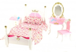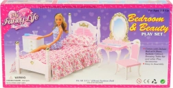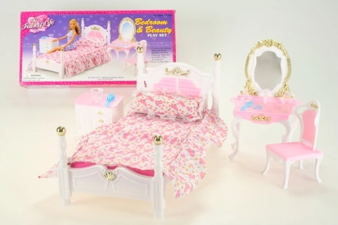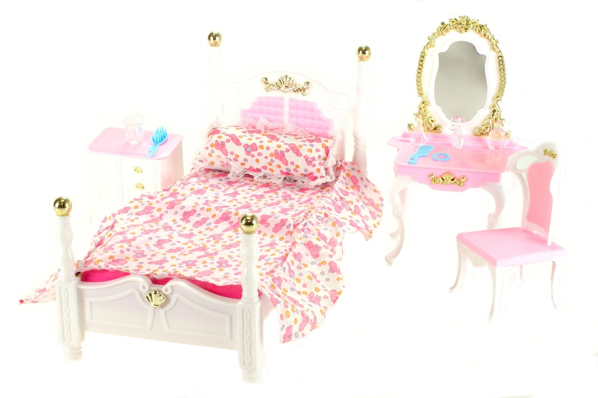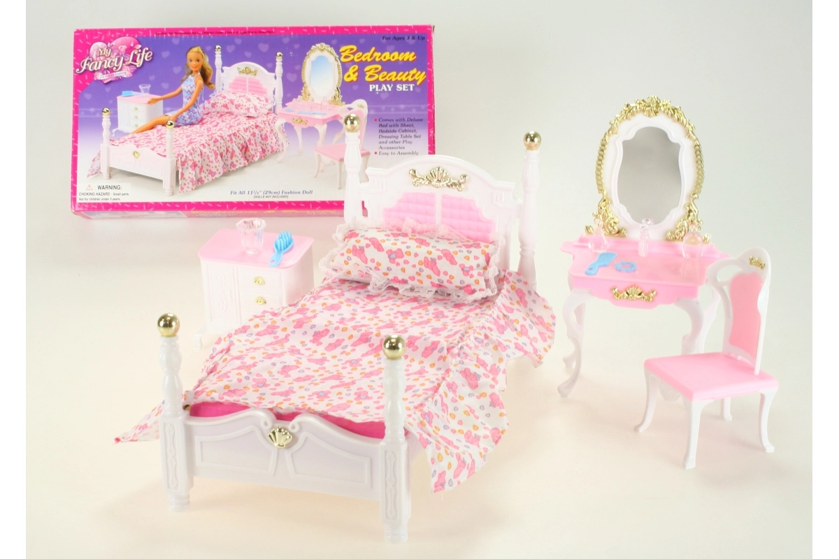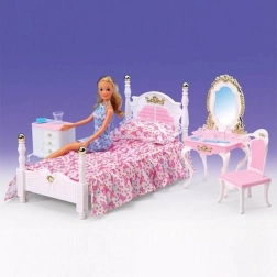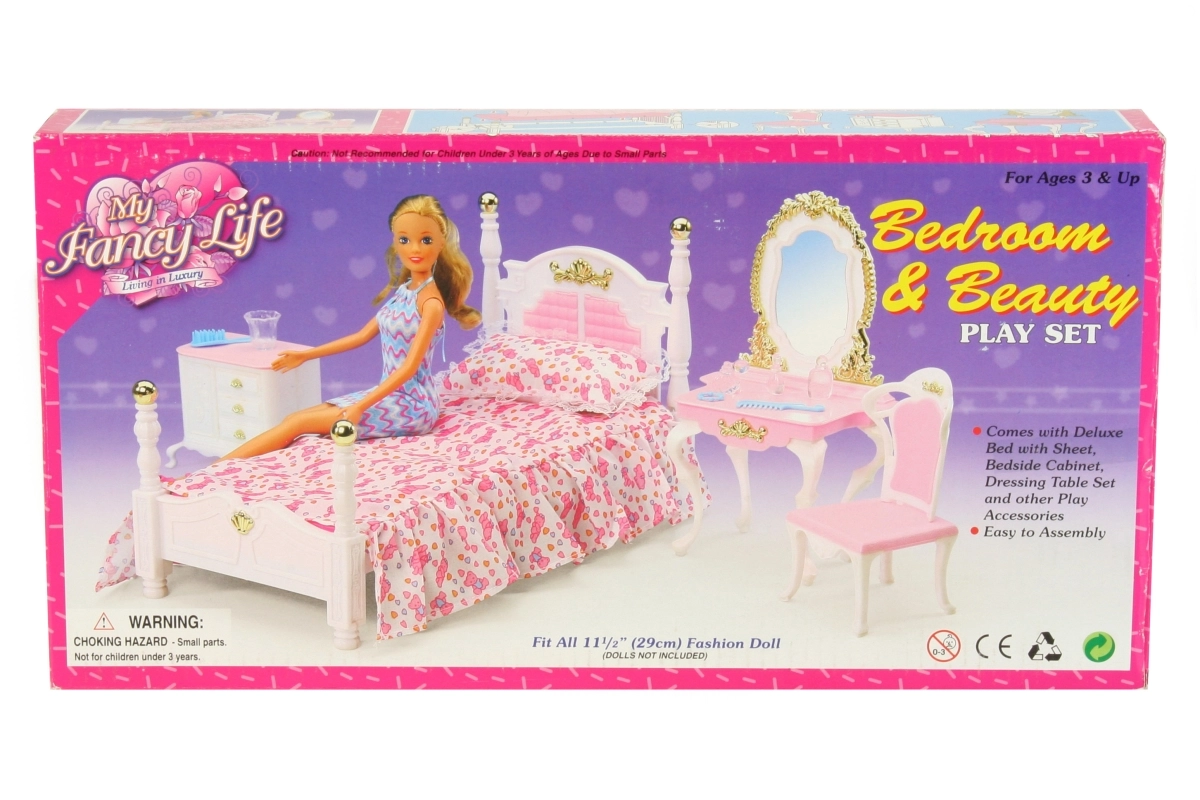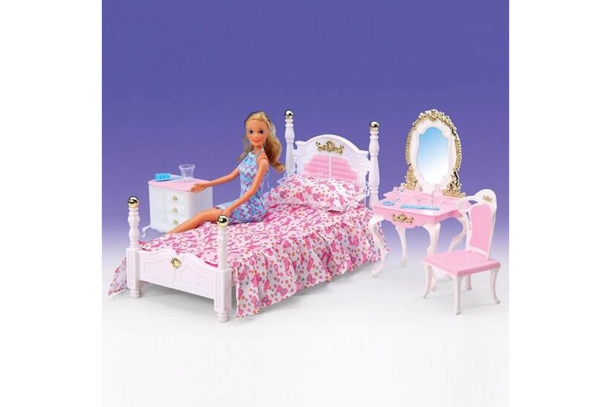 Glorie Soveværelse indeholder en plastikseng med mål ca. 16 cm x 34 cm x 18 cm med sengetæppe og pude, et toiletbord med mål ca. 13 cm x 8 cm x 22 cm med tilbehør til dukker – kam, armbånd, børste og flasker, en stol ca. 7 cm x 7 cm x 13 cm, samt et natbord ca. 8,5 cm x 6 cm x 8 cm. Dukke medfølger ikke. Alder 3+