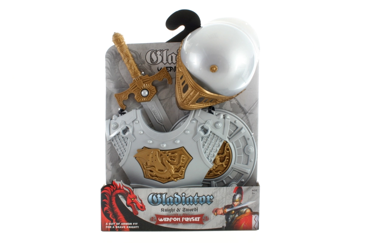Sættet inkluderer et dekorativt sværd og skjold, som kompletteres af brystplade og hjelm for et autentisk udseende. Sættet er designet med fokus på komfort og nem påklædning, så det passer til kostumer, fastelavn og fri leg.