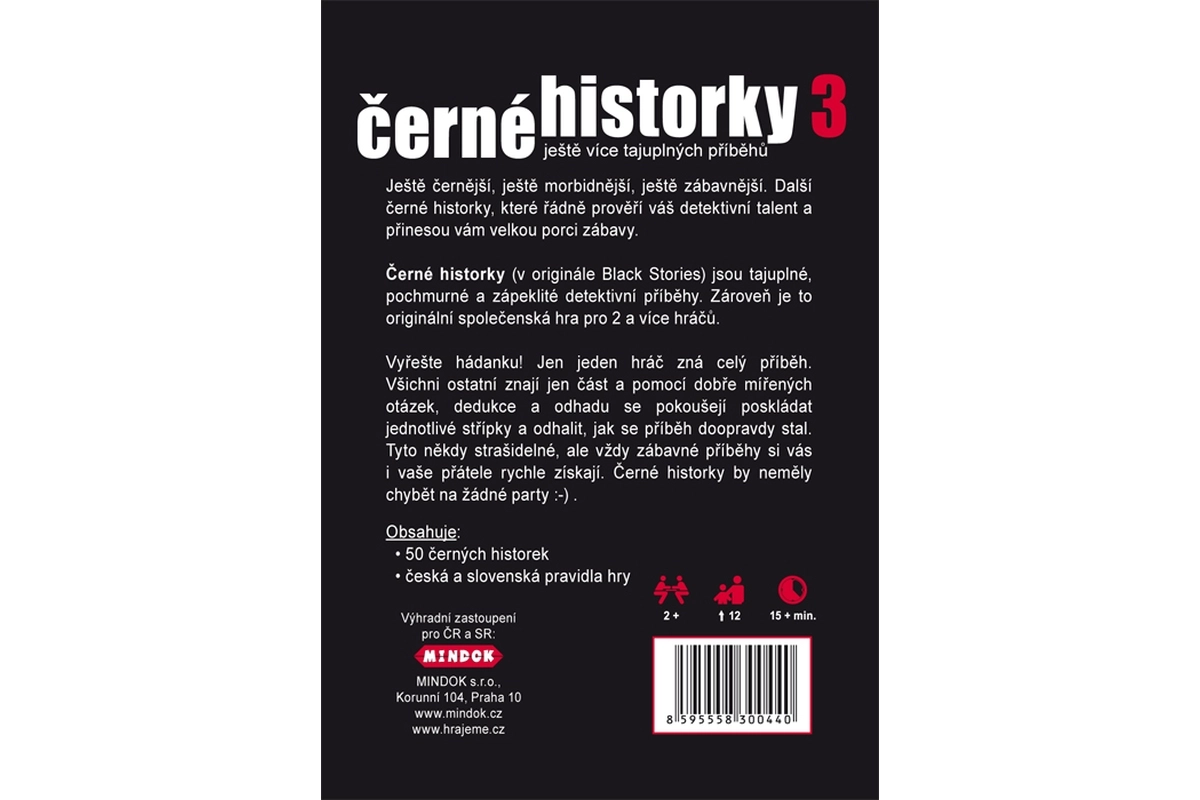 Sorte historier 3 bringer endnu sortere, mere morbide og sjovere historier, der både underholder og udfordrer dine grå hjerneceller. Én spiller kender hele sagen, de andre forsøger ved hjælp af spørgsmål, deduktion og logik at samle brikkerne og opklare mysteriet. Ideelt til aftener med venner, familiesammenkomster og som icebreaker til fester.