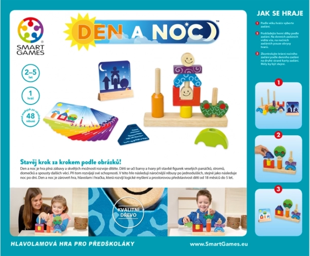 Oplev magien i Smart Games Dag og nat – et klogt legetøj, der kombinerer logiske hovedbrud, læring af farver og former og udvikling af rumlig forestillingsevne. Børn fra 18 måneder bygger glade figurer, træer og huse efter opgaver, der flyder fra nemme dagsopgaver til mere krævende natlige gåder.