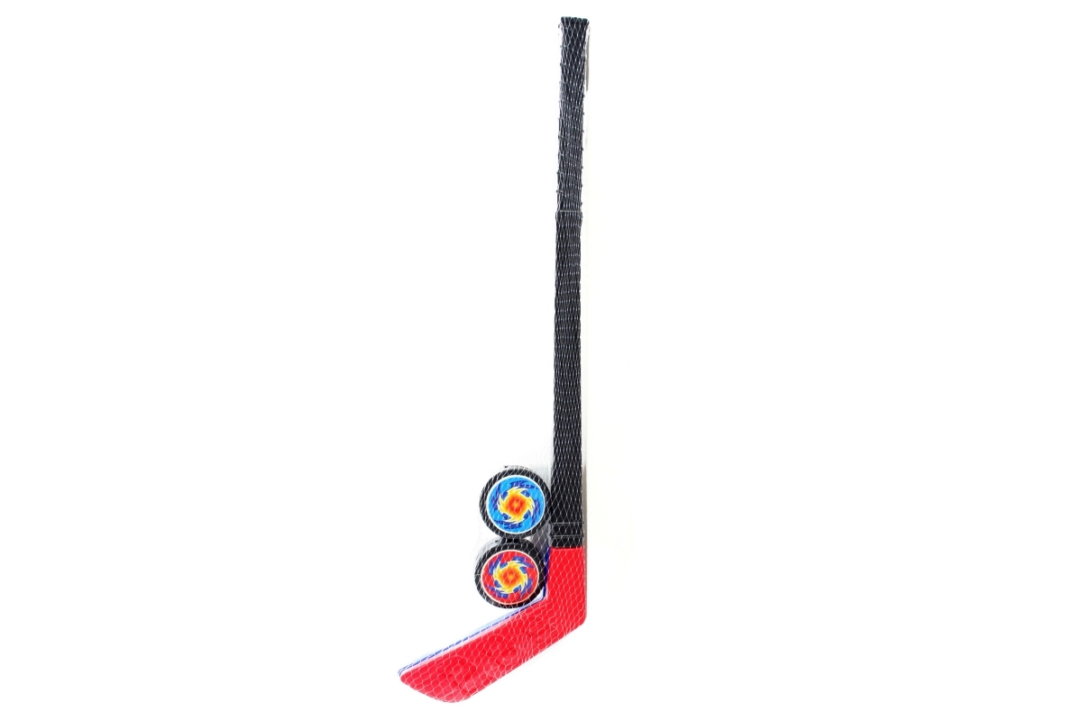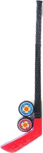 To plastikhockeykøller i net med en længde på ca. 57 cm, hver i en anden farve, samt 2 pukke. Alder 3+