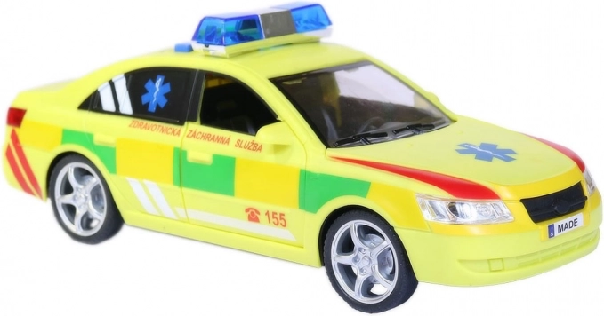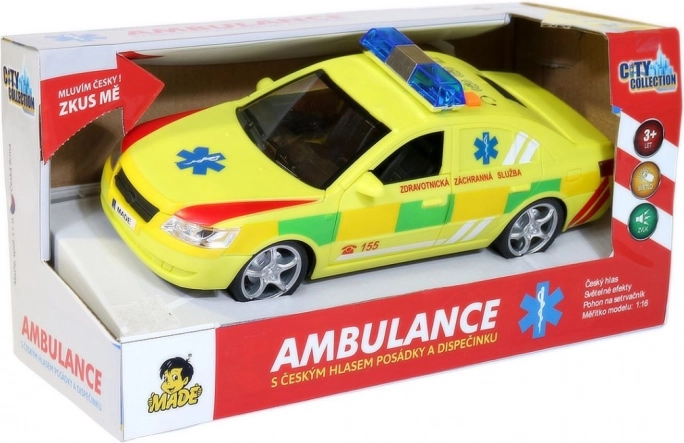 Realistisk ambulance 1:16 med lys, danske meldinger og friløb. Åbnende døre, AG13-batterier medfølger. Fantastisk legetøj til børn fra 3 år.