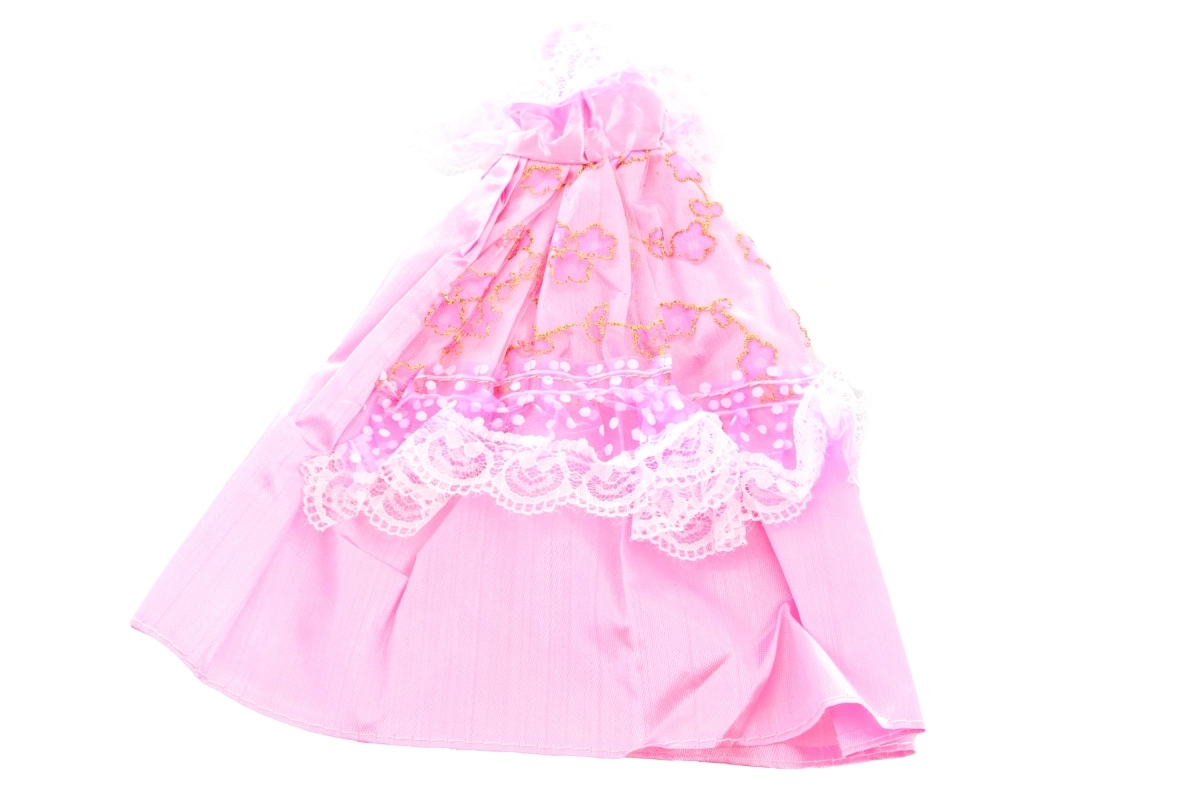 Blondepynt, glitter og blomster motiver giver dukken et festligt look.