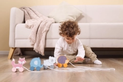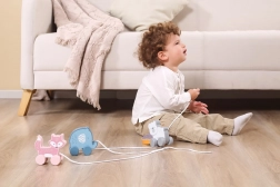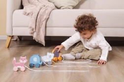 Takket være de bevægelige hjul og muligheden for at trække, støtter legetøjet fysisk udvikling og koordination.