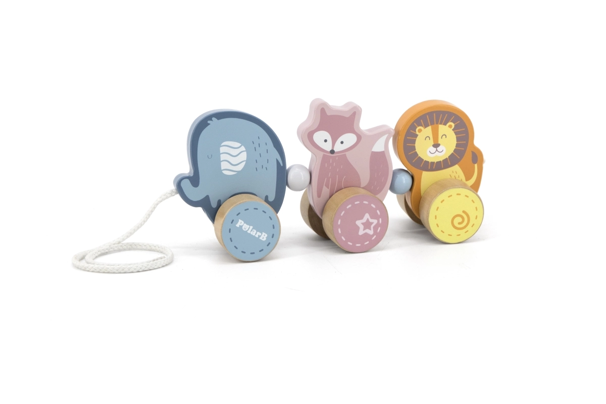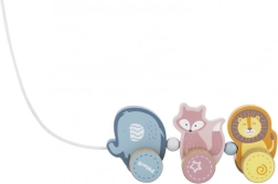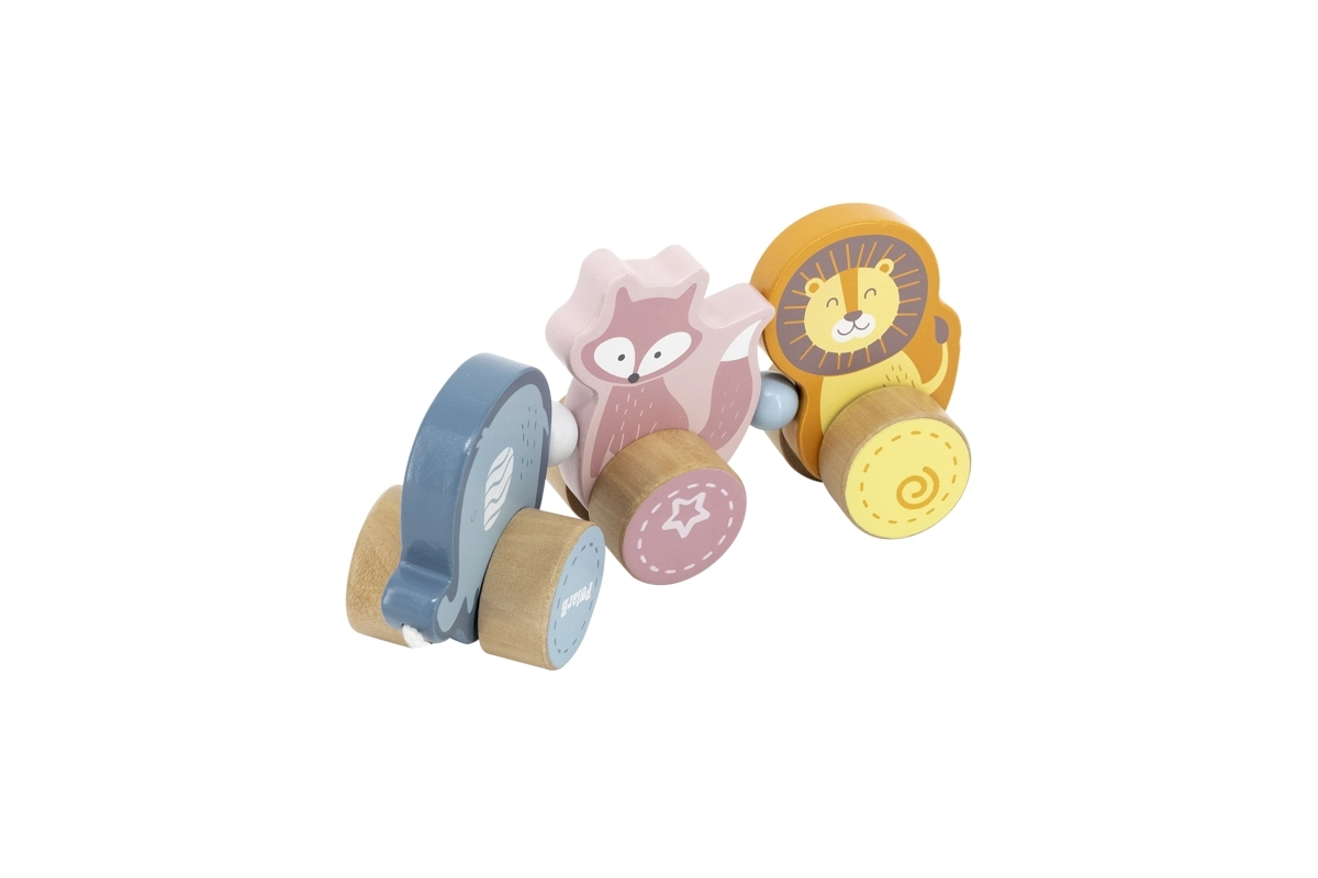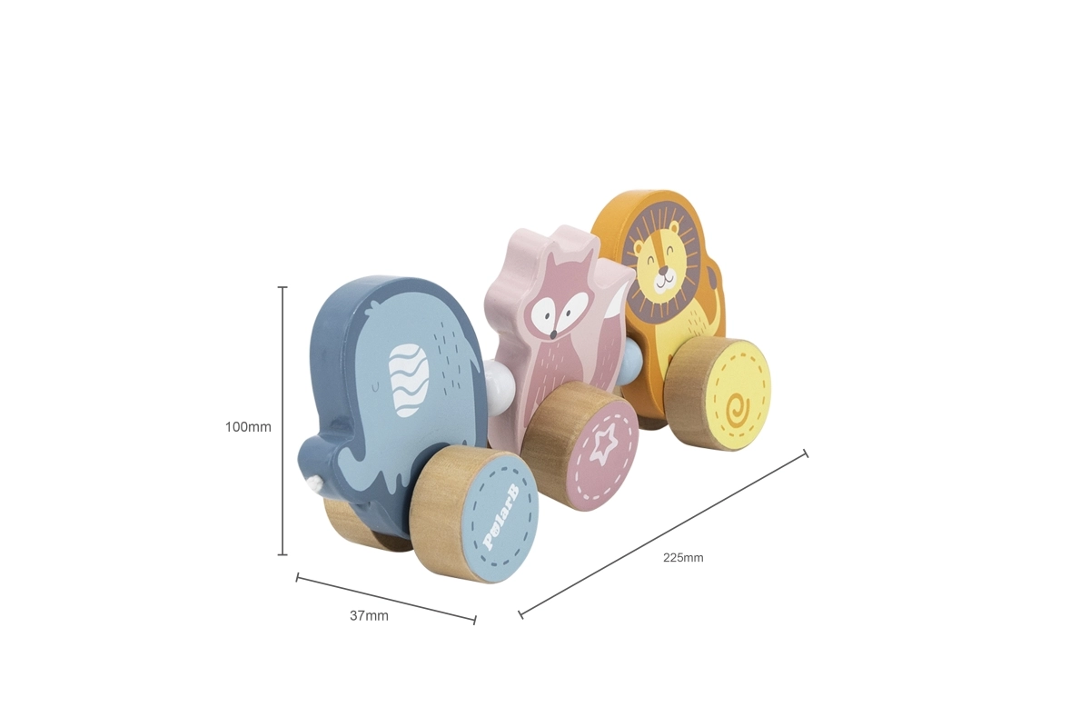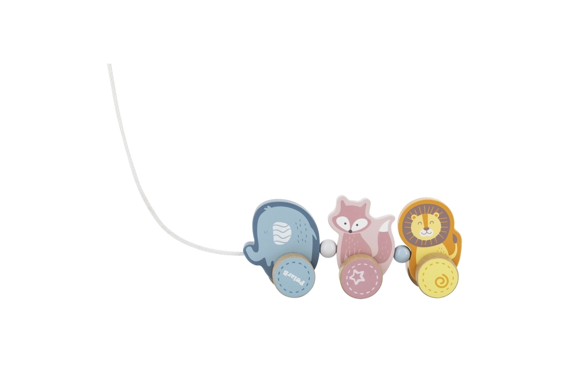 Denne kvalitets træklegetøj i blide pastelfarver er designet til små børn, der lærer at gå og udforske verden. Tre søde dyr – elefant, ræv og løve – er forbundet og ruller let på træhjul. Takket være den stærke træksnor kan legetøjet nemt føres, motiverer børn til bevægelse og udvikler naturligt balance og koordination.