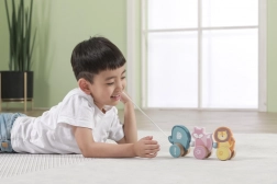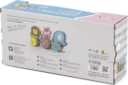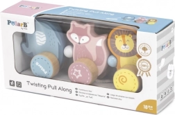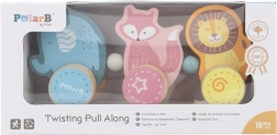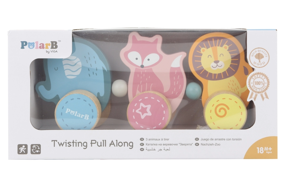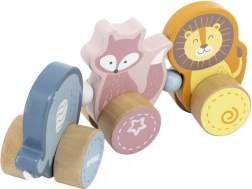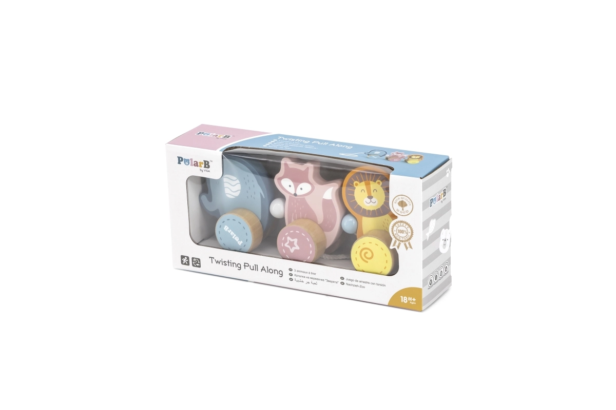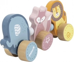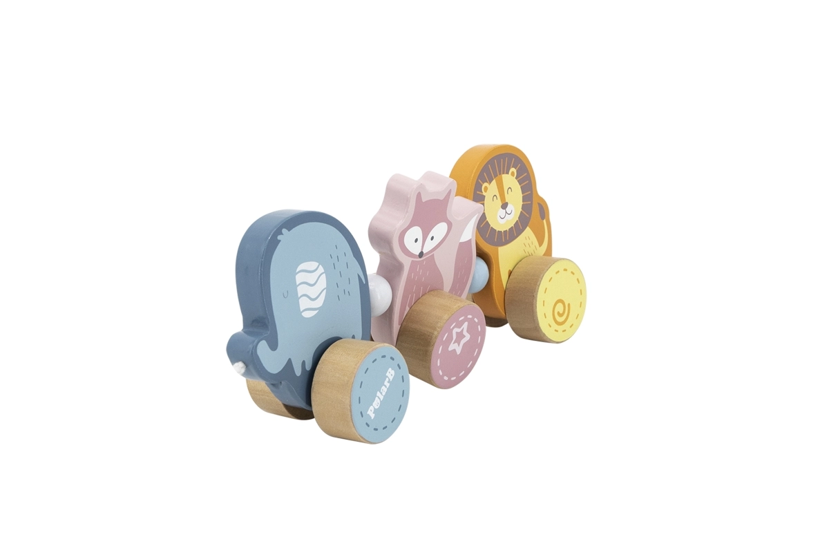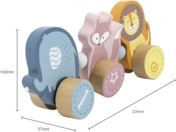 Denne kvalitets træklegetøj i blide pastelfarver er designet til små børn, der lærer at gå og udforske verden. Tre søde dyr – elefant, ræv og løve – er forbundet og ruller let på træhjul. Takket være den stærke træksnor kan legetøjet nemt føres, motiverer børn til bevægelse og udvikler naturligt balance og koordination.
