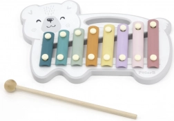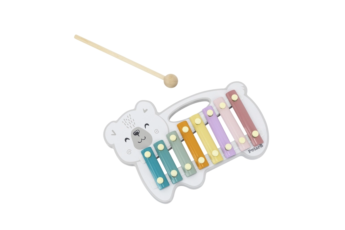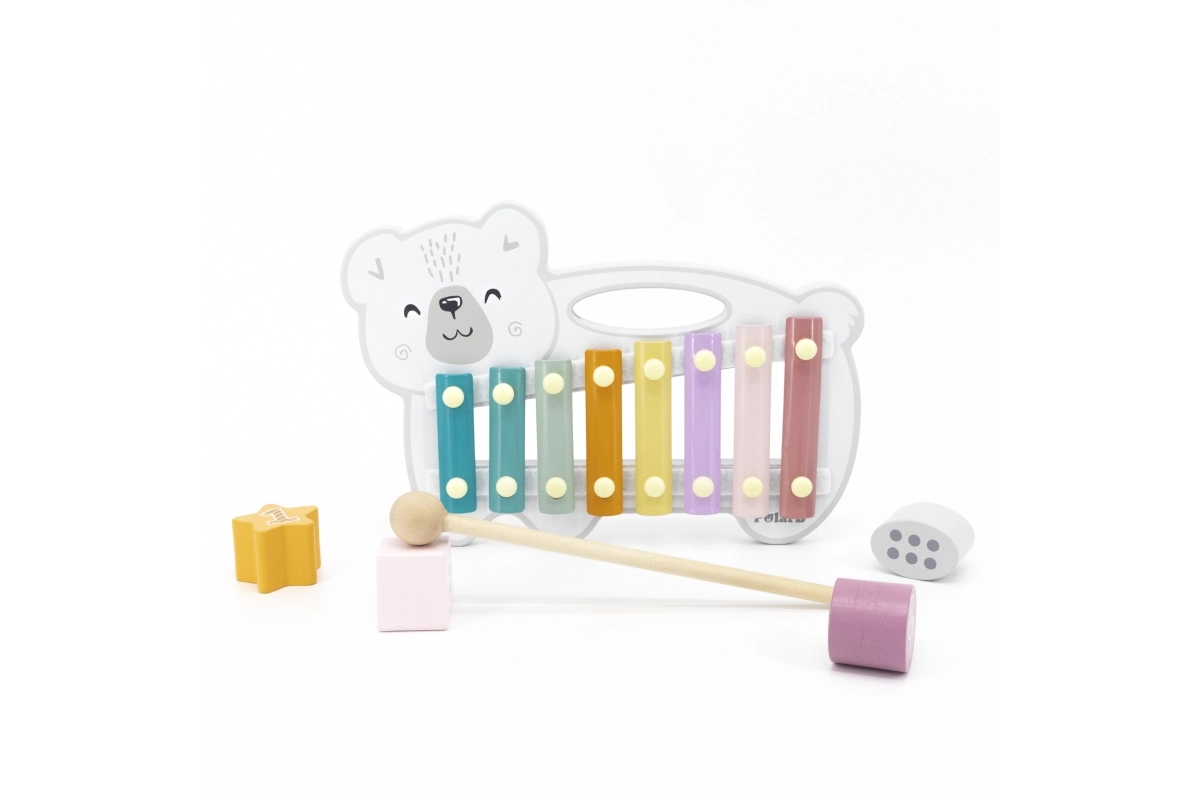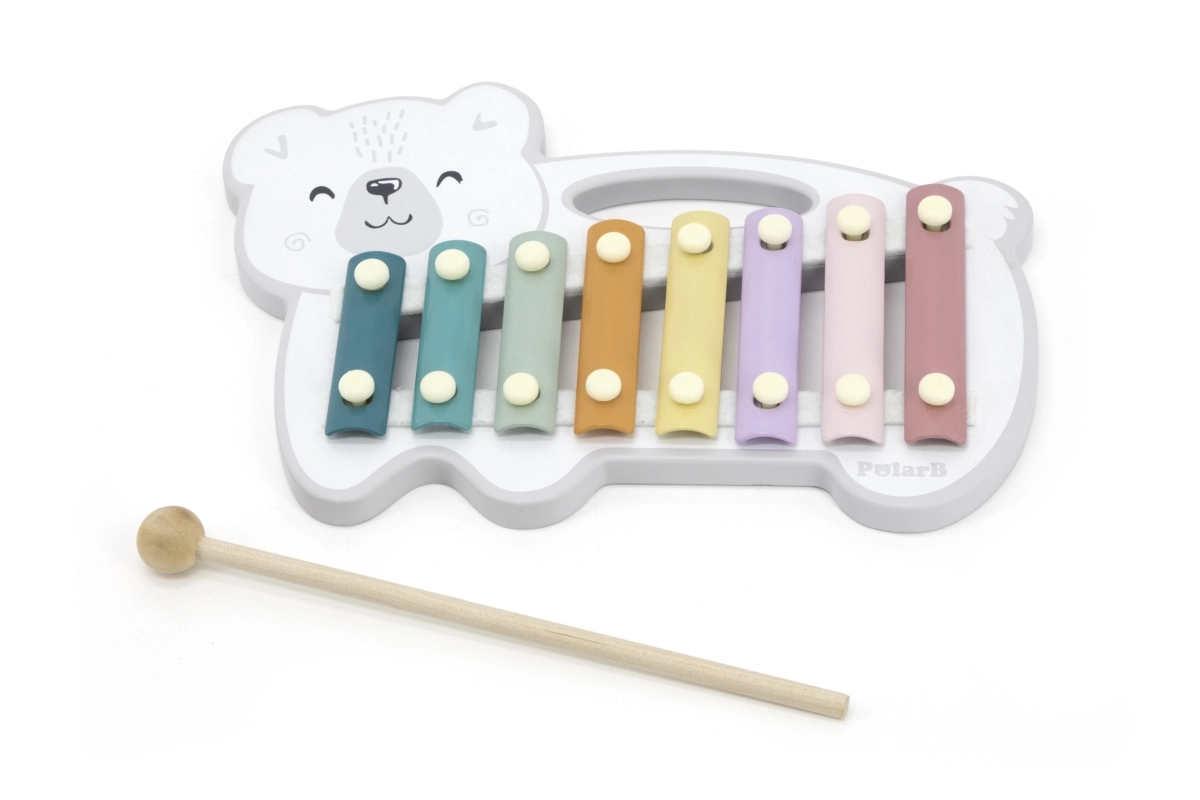 Den træxylofon formet som en isbjørn kombinerer legende æstetik med et funktionelt musikinstrument. Pastelfarvede metalplader skaber behagelige toner ved slag med træklubben og motiverer børn til naturligt at eksperimentere med lyde og rytmer.