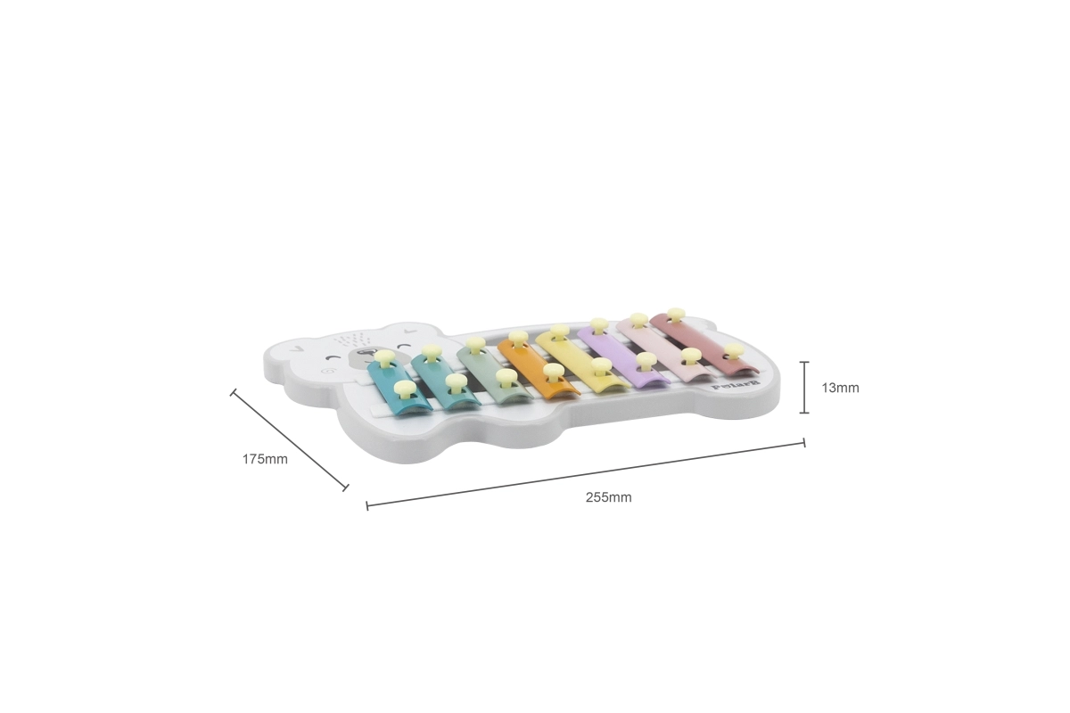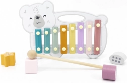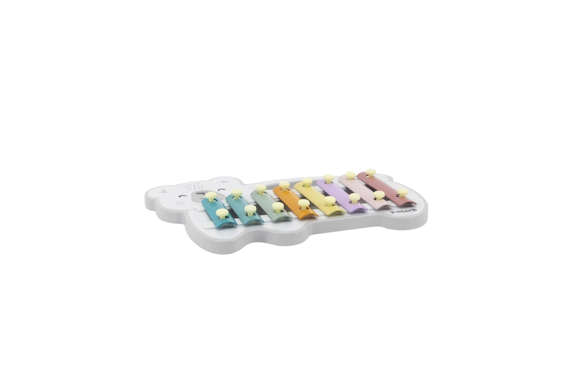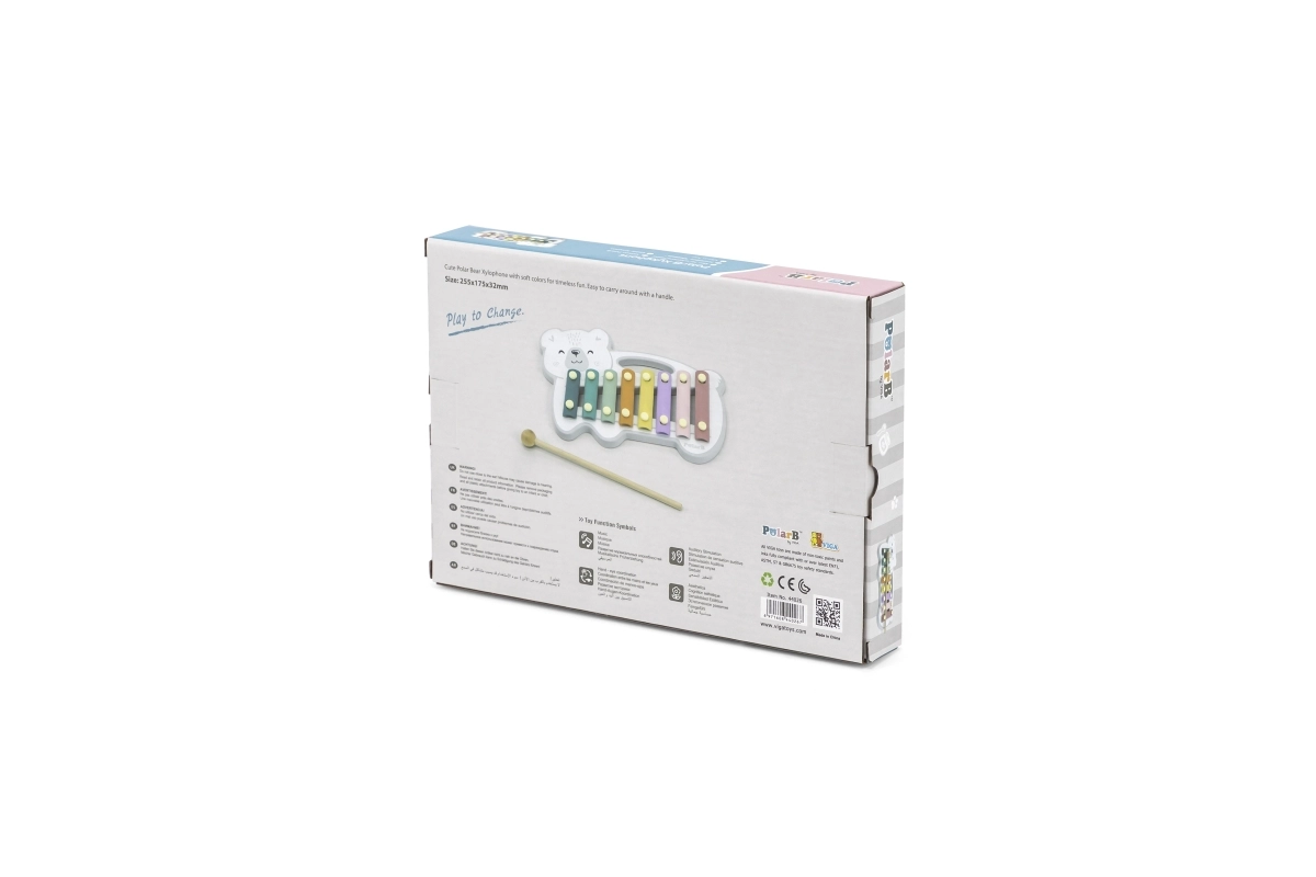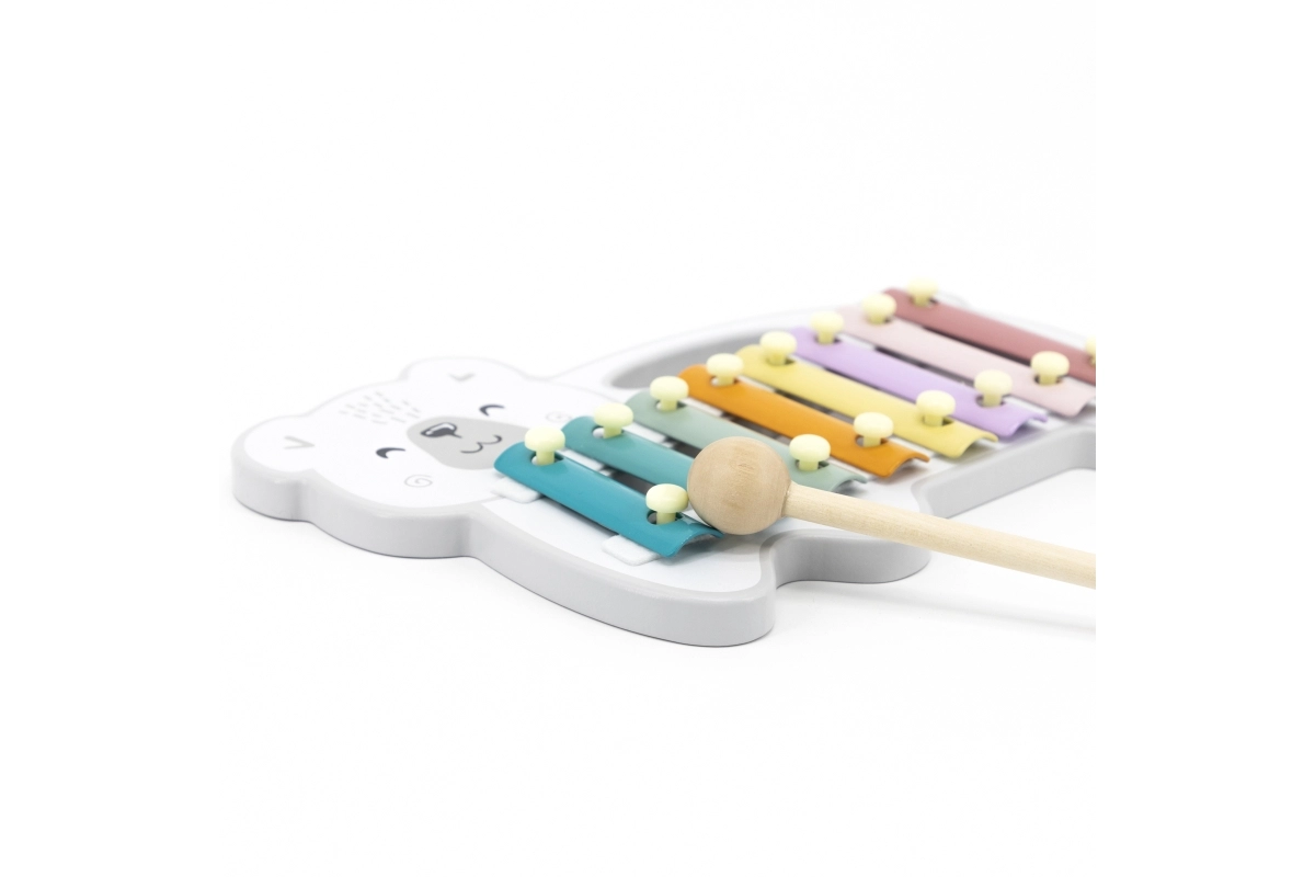 Den træxylofon formet som en isbjørn kombinerer legende æstetik med et funktionelt musikinstrument. Pastelfarvede metalplader skaber behagelige toner ved slag med træklubben og motiverer børn til naturligt at eksperimentere med lyde og rytmer.
