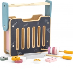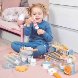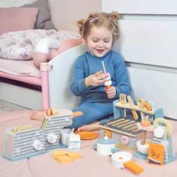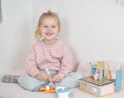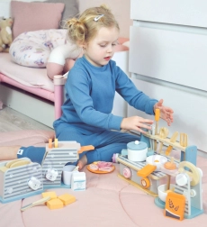 Dette stilfulde trækøkken 2-i-1 kombinerer klassisk madlavning med grill. Takket være den sammenklappelige konstruktion kan det let tilpasses både pladsen og den lille koks præferencer. To kogeplader med drejeknapper giver legen et realistisk præg og lader børn øve finmotorik og fantasi.