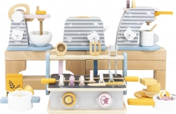 Alt, hvad der behøves til de første opskrifter: to gryder og grundlæggende redskaber (kniv, ske, spatel, tang), spydpinde og træmad som kød, æg og grøntsager. Det farverige design indbyder til leg og understøtter rollen som lille kok.