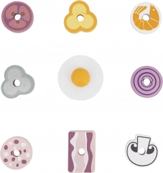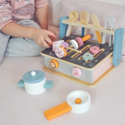 To gryder, en kniv, en ske, en spatel, en tang, spydpinde og træmad (kød, æg, grøntsager) understøtter fantasifuld rolleleg uden ekstra køb.