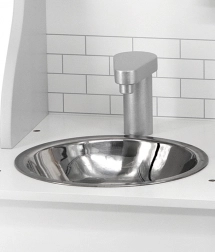 Indbygget timer og skab til opbevaring af service fremmer organisering, ansvarlighed og finmotorik under legen.