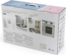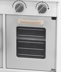 Der medfølger et omfattende sæt tilbehør: gryde med låg, pande med spejlæg, ske, hulske/stegepalette, dejskraber samt salt- og peberbøsse. De drejelige 4 knapper med “klik”-lyd og en tydelig mekanisk timer giver legen et realistisk præg. Det nederste skab fungerer som opbevaringsplads til madvarer og service og lærer børn orden.