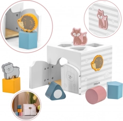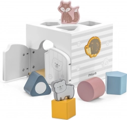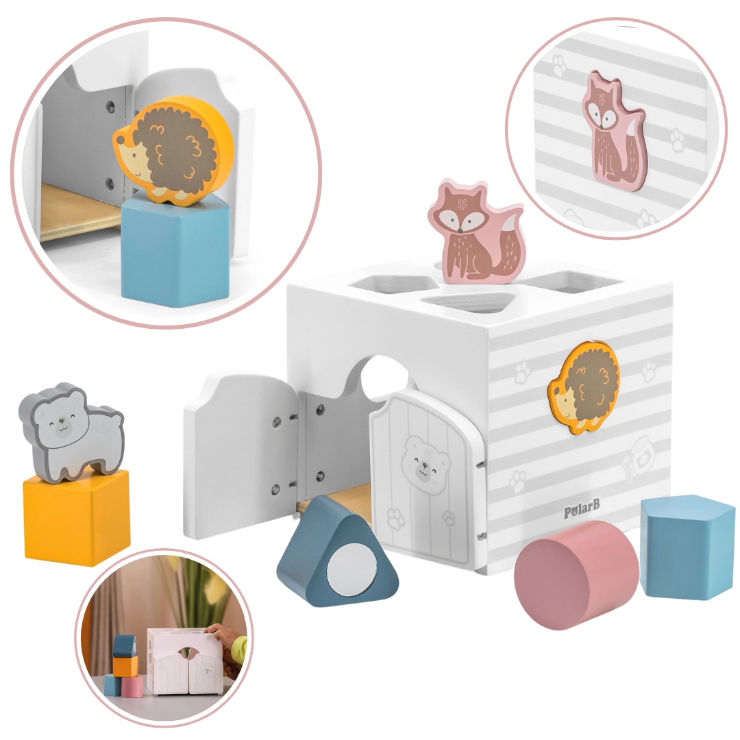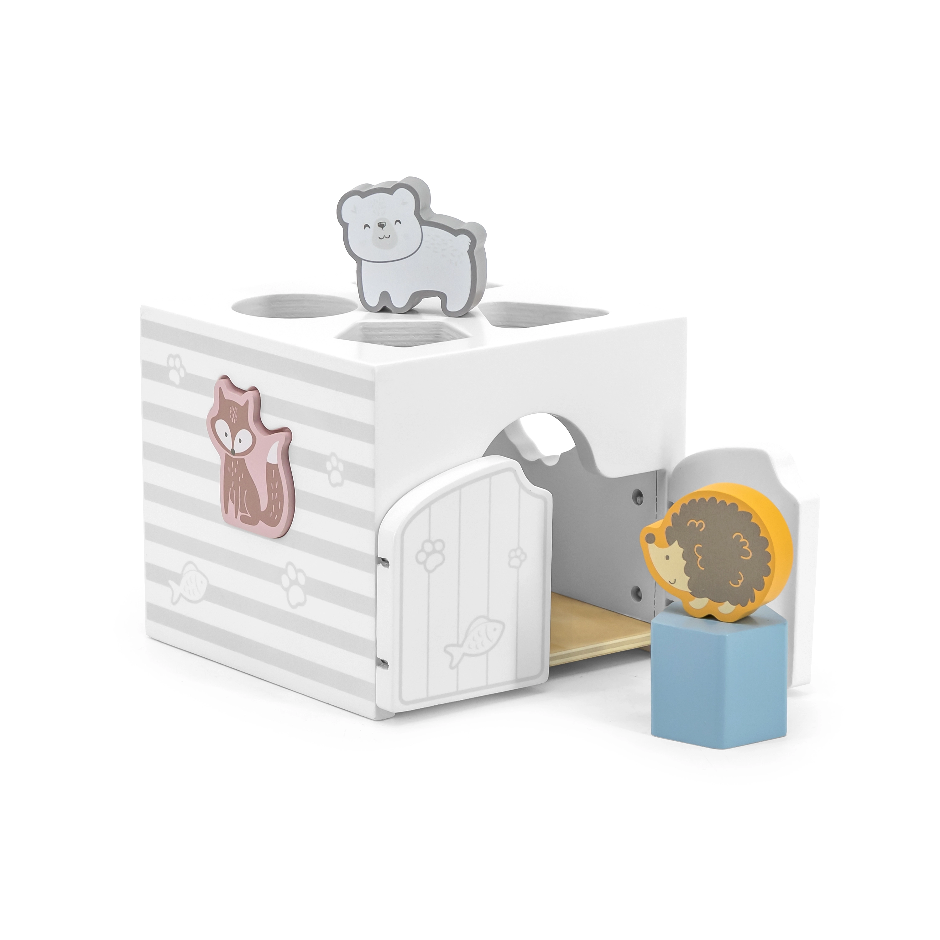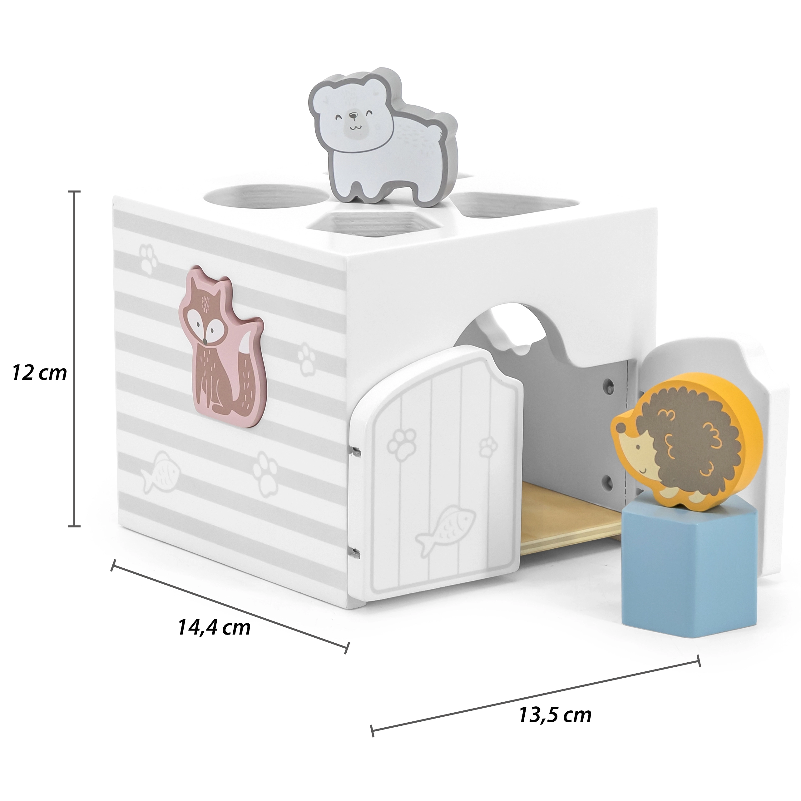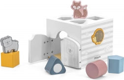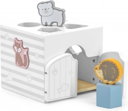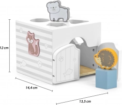 Træindsats med dyr. Klodserne rasler. Mål på indsatsen ca. 13,5 x 12 x 14,4 cm. Emballagemål ca. 15 x 14,5 x 13 cm. Alder 18 m+