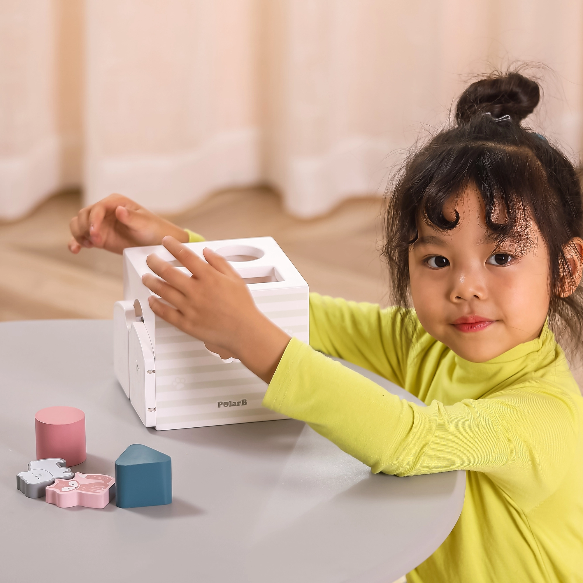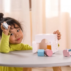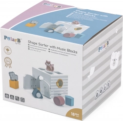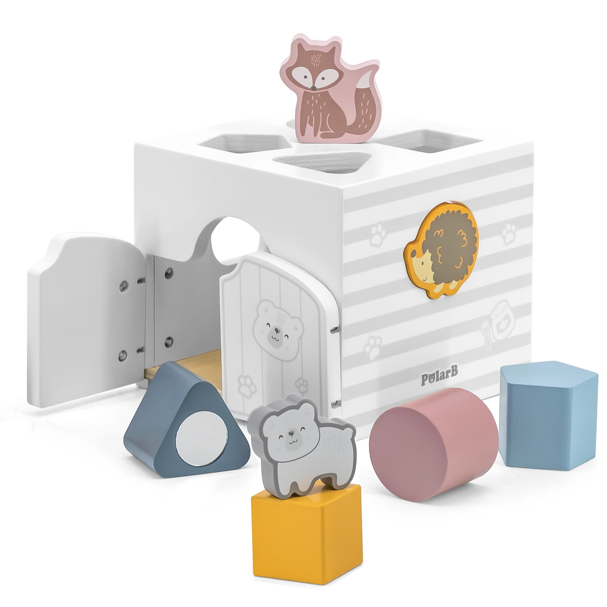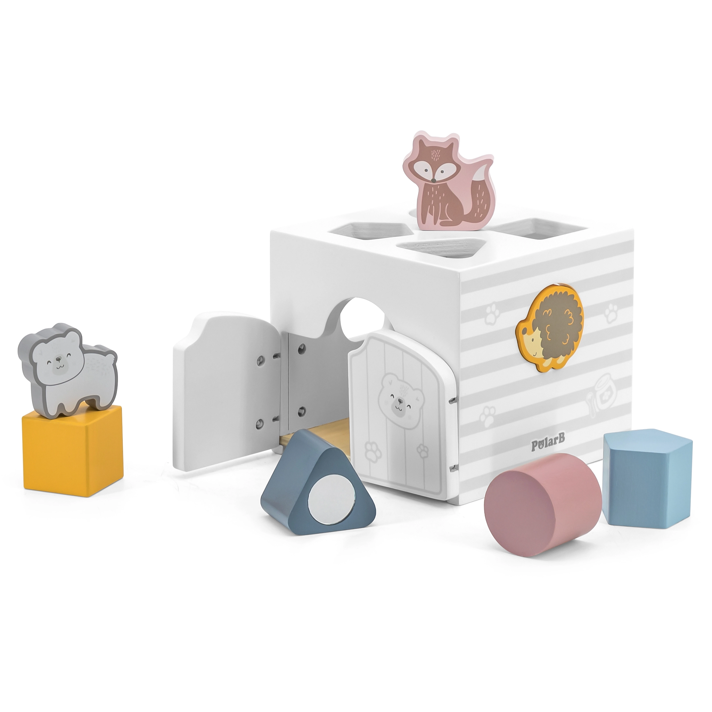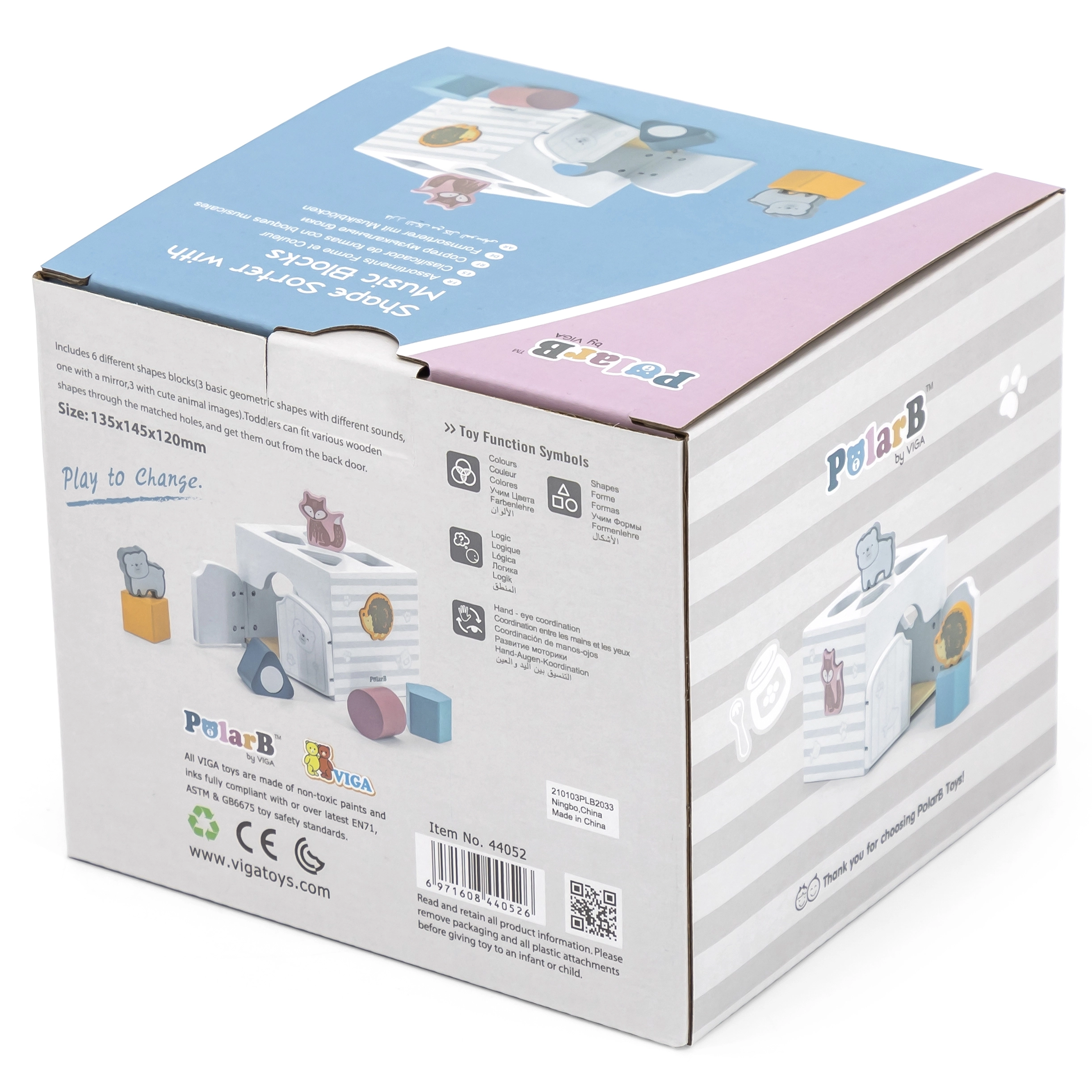 Træindsats med dyr. Klodserne rasler. Mål på indsatsen ca. 13,5 x 12 x 14,4 cm. Emballagemål ca. 15 x 14,5 x 13 cm. Alder 18 m+