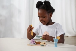Takket være robust træ og kvalitetsforarbejdning er sættet modstandsdygtigt til daglig leg. Velegnet til legekøkken, legerum og på farten. Leg med mad understøtter farver, former og grundlæggende regler for bordskik.
