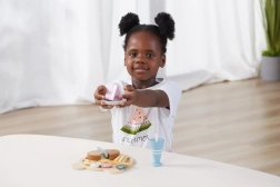 Farverige madstykker, dessert og drik gør det muligt for børn at servere frokost som i virkeligheden og øve grundlæggende bordskik.