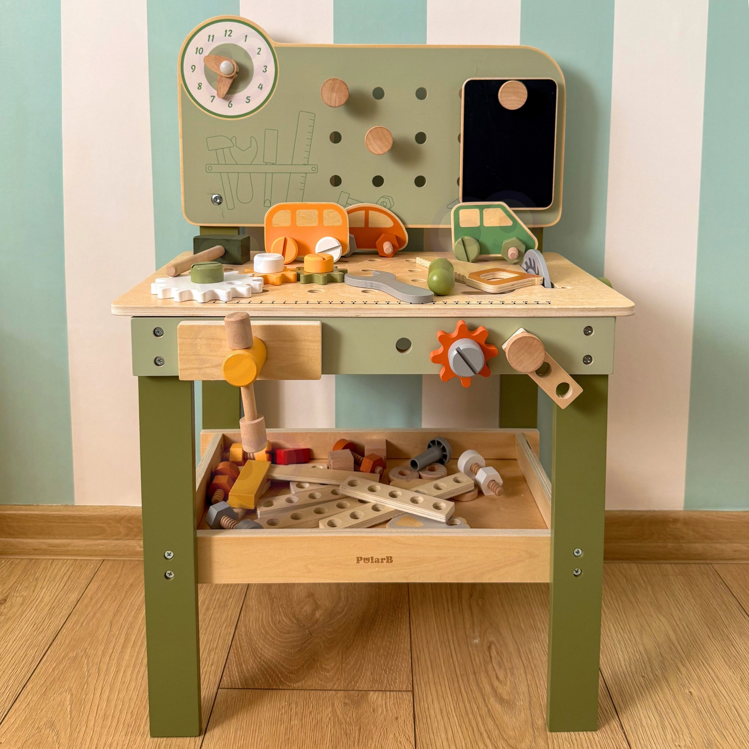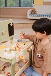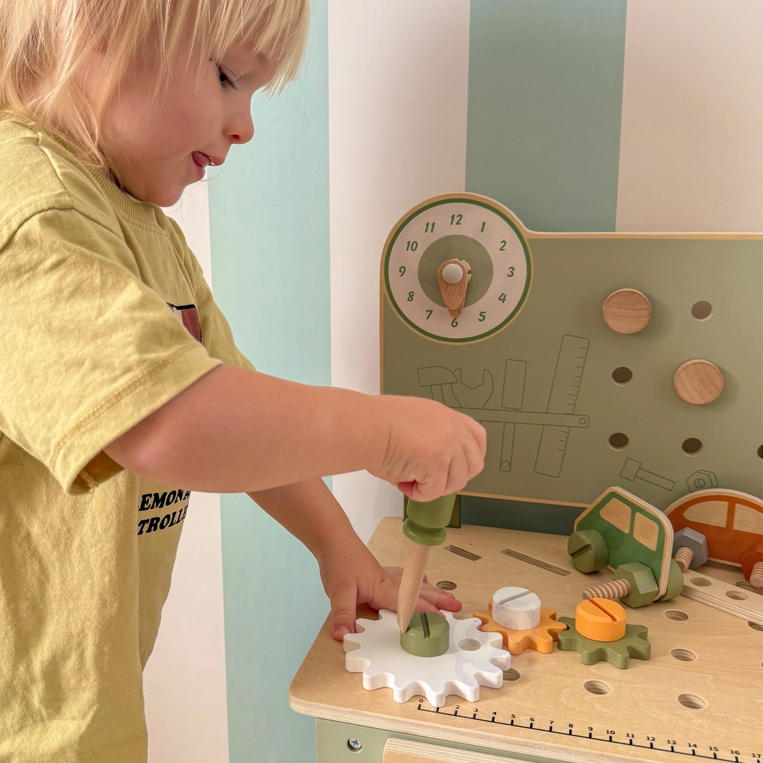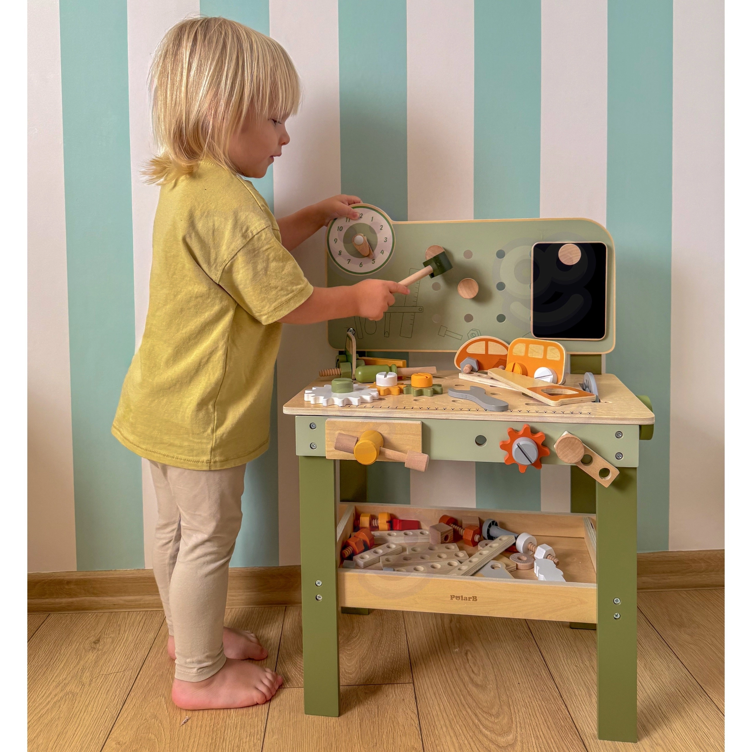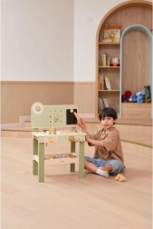 Leg med arbejdsbænken understøtter finmotorik, hånd-øje-koordination, logisk tænkning og kreativitet. Den træbaserede udførelse er holdbar og behagelig at røre ved, hvilket gør den velegnet til daglig leg derhjemme og i børnehaven.