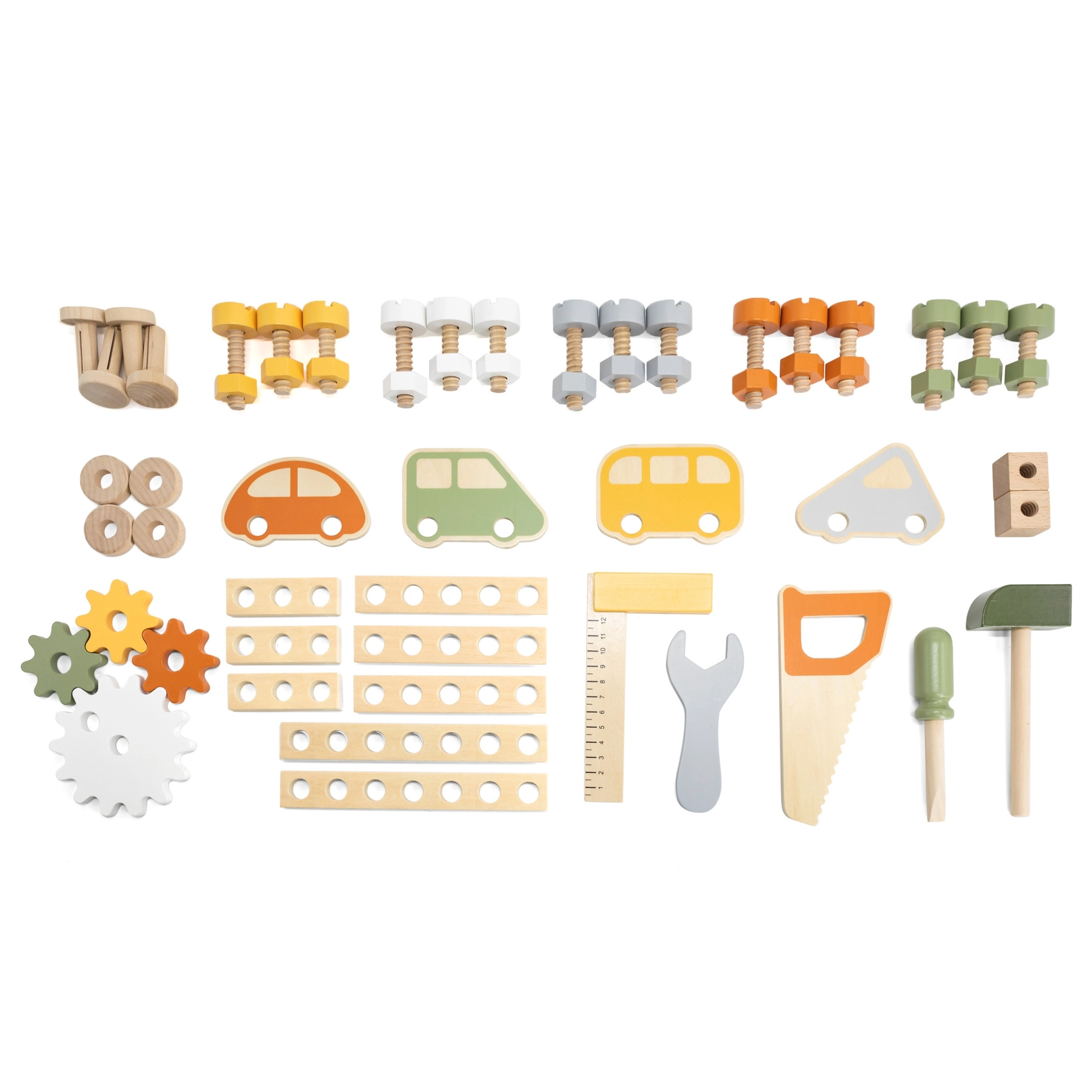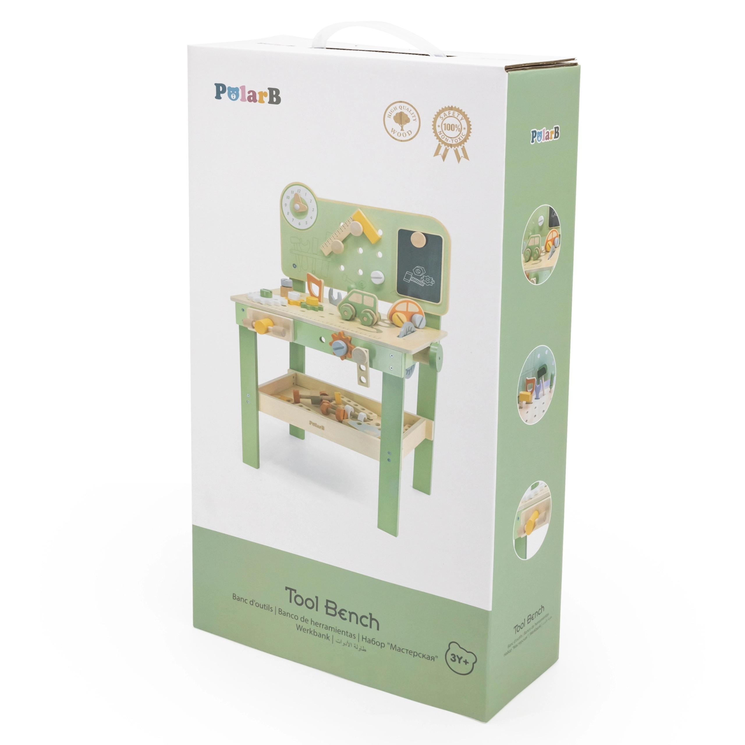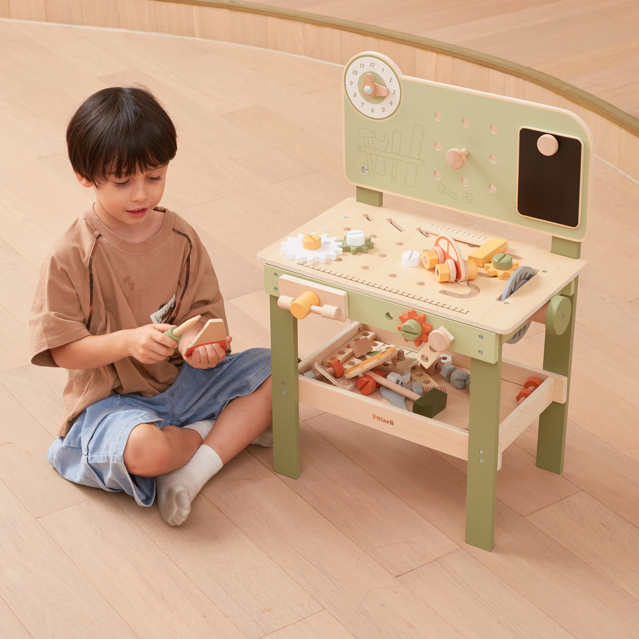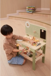 Leg med arbejdsbænken understøtter finmotorik, hånd-øje-koordination, logisk tænkning og kreativitet. Den træbaserede udførelse er holdbar og behagelig at røre ved, hvilket gør den velegnet til daglig leg derhjemme og i børnehaven.
