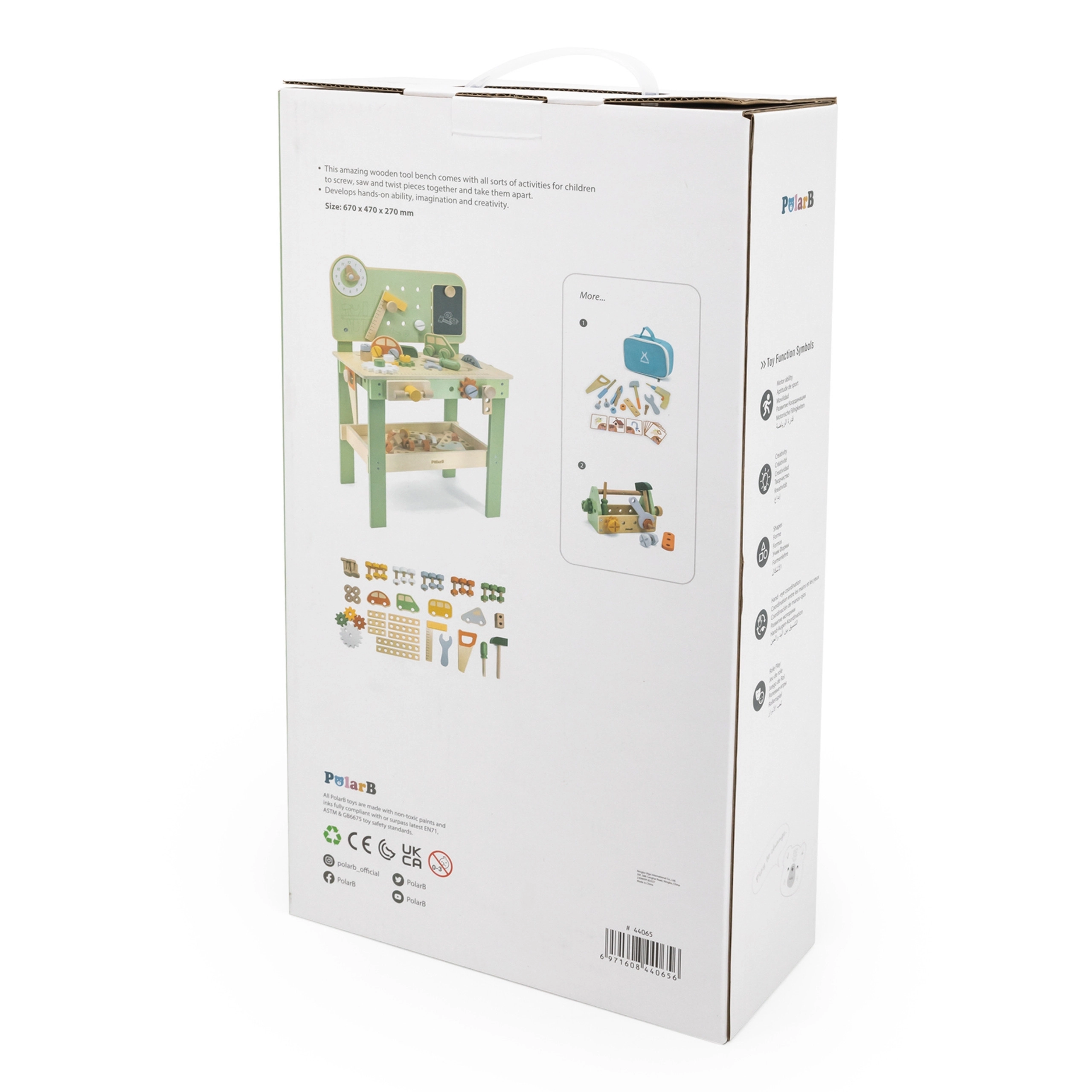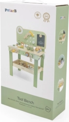 Opdag et kvalitets træværksted til børn fra den eksklusive serie POLARB fra VIGA. Små gør-det-selv-arbejdere kan hamre søm, stramme skruer med nøgle, fastgøre plader og tandhjul og på legende vis træne finmotorikken. Inkluderer ur med visere, en træ bil, en praktisk hylde til værktøj og en tavle til tegning for endnu mere sjov.