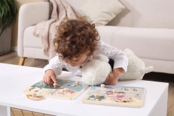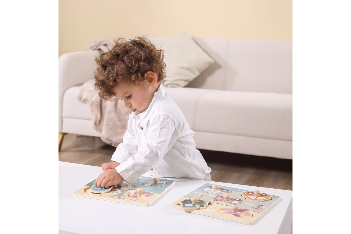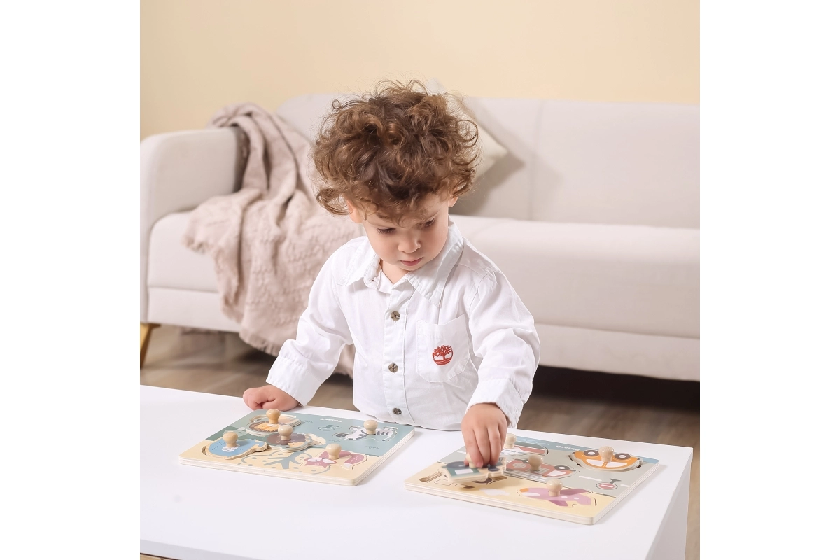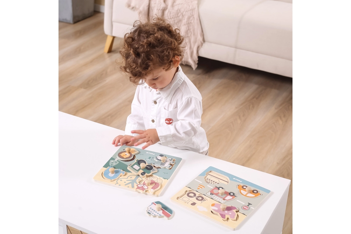 Træindlægningspuslespil med motiv af transportmidler. Mål på træpladen ca. 22 x 22 cm. Pakningsmål ca. 22 x 22 x 2,5 cm. Alder 18 m+.