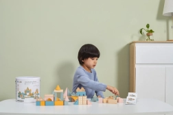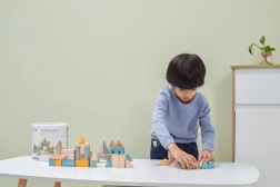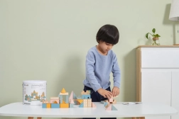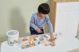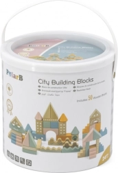 Dette kvalitetsbyggesæt i træ leveres i en spand og indeholder 50 omhyggeligt forarbejdede dele i behagelige pastelfarver. Børn kan bygge små huse, tårne og hele byer, mens de samtidig udvikler koordination, logisk tænkning og kreativitet.
