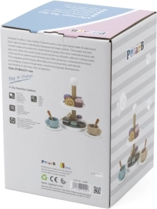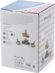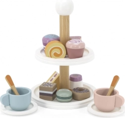 Det elegante stativ med to niveauer rummer alle kagerne og skaber en realistisk scene til tesalonen. Børn øver legende deres finmotorik, når de arrangerer.