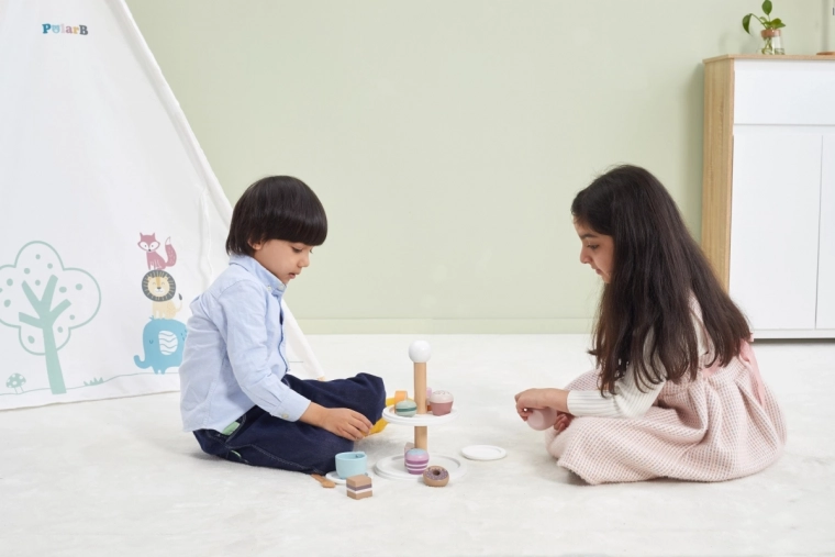 Trætesættet er ideelt til børns første sociale lege. Et to-etagers stativ med desserter, to tallerkener, to kopper og skeer skaber den perfekte scene til eftermiddagste eller festlig servering. Takket være den omhyggelige udførelse i robust træ er legetøjet behageligt at røre ved og sikkert for små hænder.