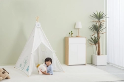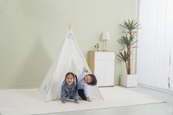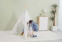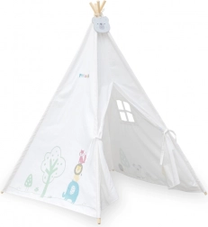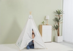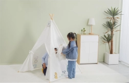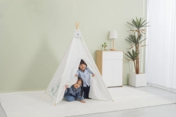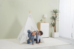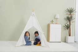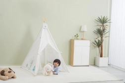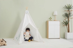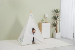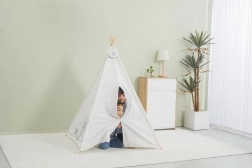 Tipiteltet POLARB forvandler ethvert rum til et magisk sted fuld af fantasi. Det minimalistiske design i hvid med søde dyremotiver passer ind i moderne interiører og skaber et roligt, inspirerende område til børnene. Den solide konstruktion med træstænger giver stabilitet under leg, og teltet er nemt at sætte op og pakke sammen.